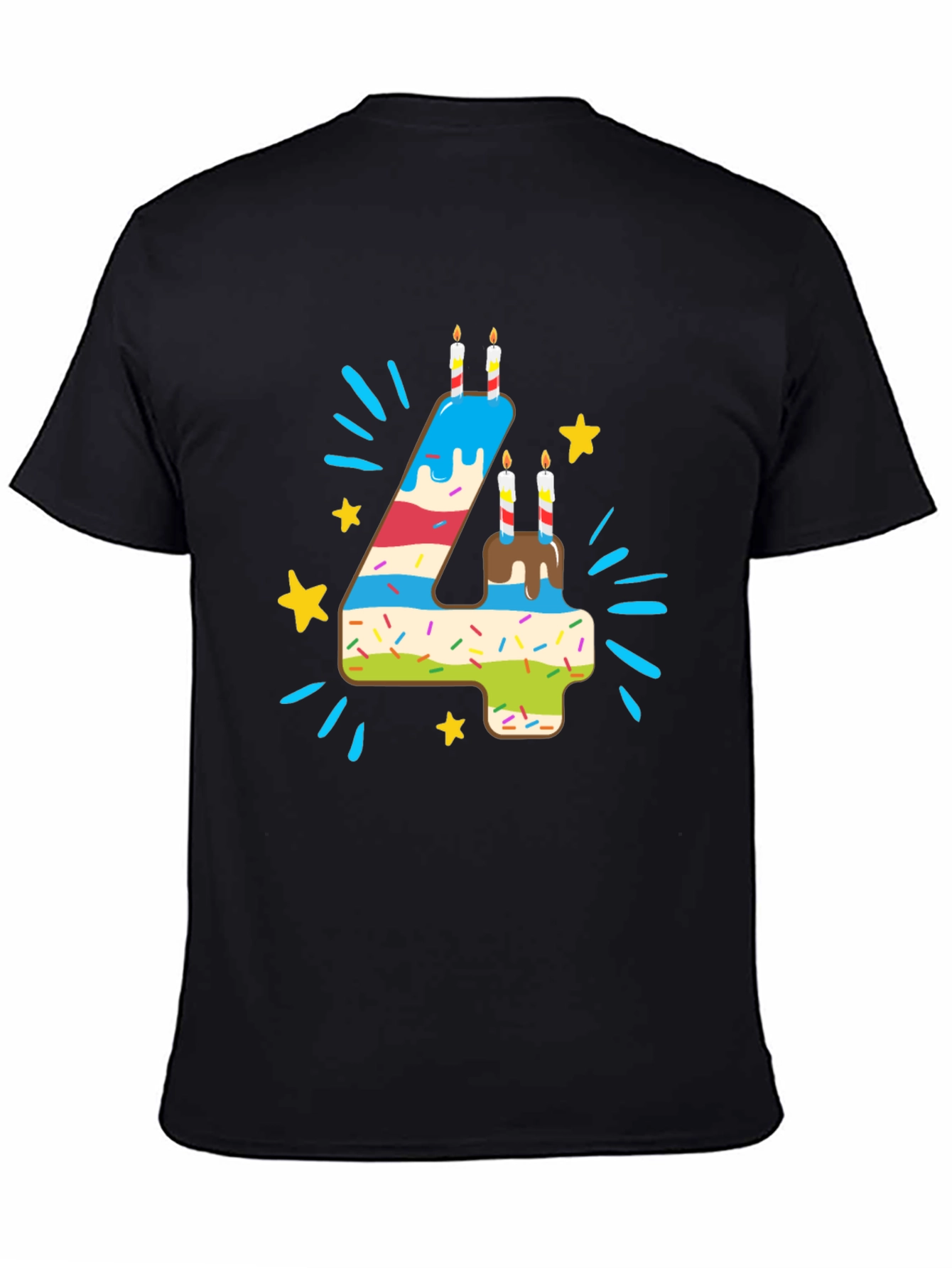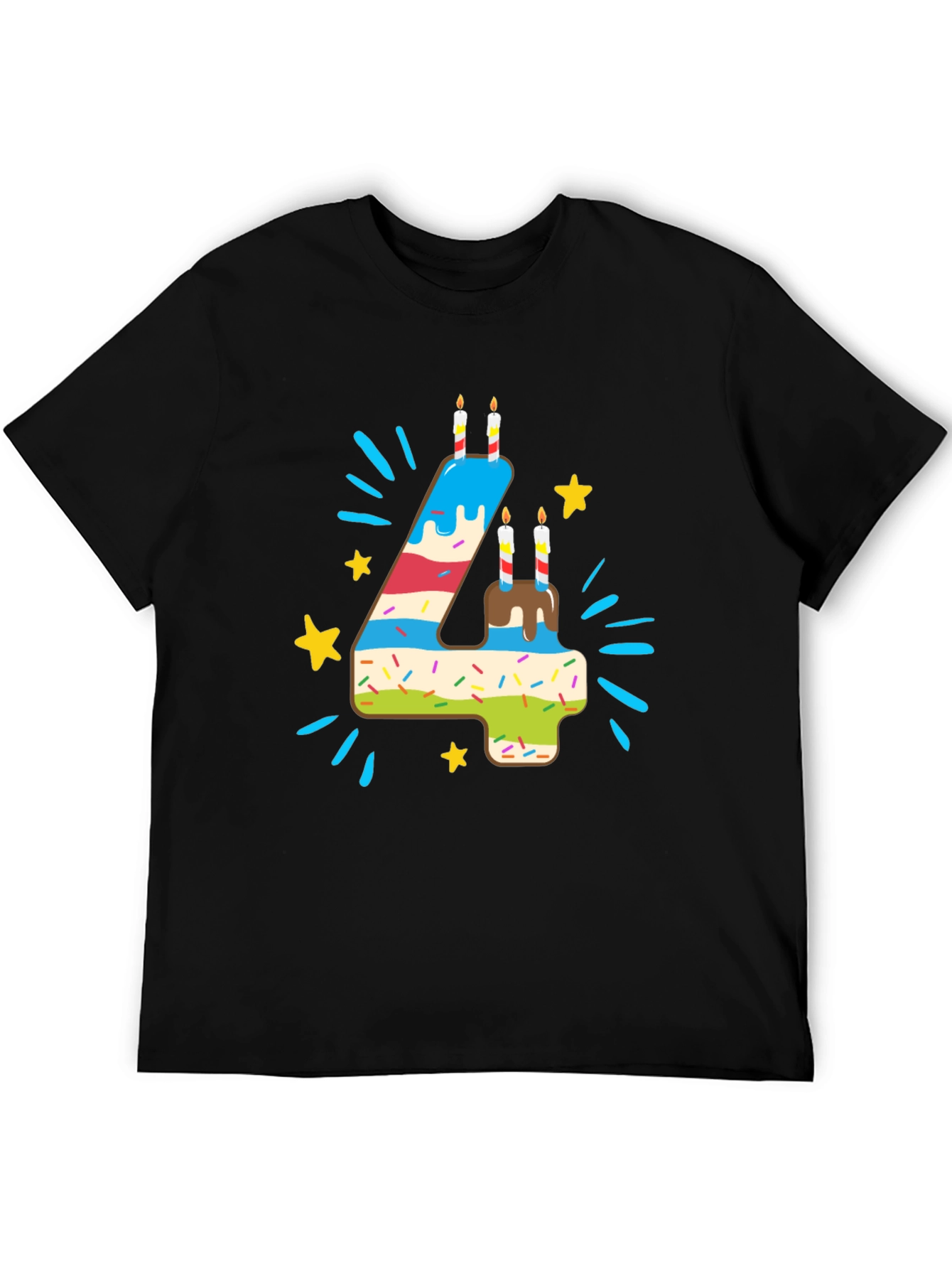 Celebrate a fourth birthday in style with this fun and festive t-shirt. The shirt features a large, colorful number '4' design that resembles a delicious birthday cake, complete with icing, sprinkles, and candles. The design is surrounded by playful stars and bursts of color, adding to the celebratory feel. Made from a comfortable material, this t-shirt is perfect for a birthday party or everyday wear. A great gift for any four-year-old! The black color makes the design pop.