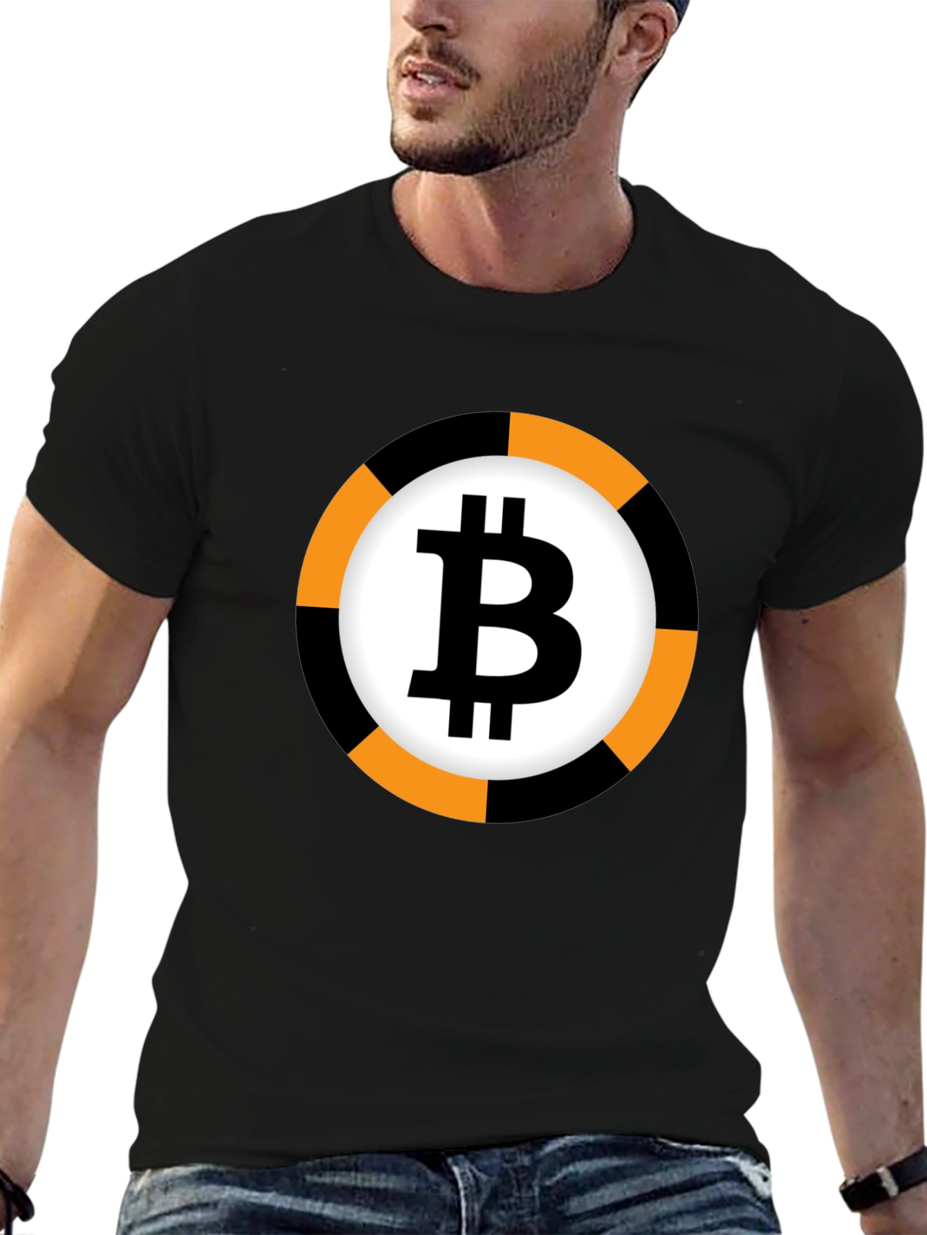 Show your love for Bitcoin with this stylish black t-shirt. Featuring a bold Bitcoin logo design in black, white, and gold, this tee is perfect for crypto enthusiasts. The shirt appears to be made from a comfortable, breathable fabric, likely cotton or a cotton blend, making it ideal for everyday wear. The classic fit and crew neck provide a timeless look that pairs well with jeans, shorts, or casual pants. Whether you're attending a crypto conference, running errands, or just relaxing at home, this Bitcoin t-shirt is a great way to express your interest in the world of digital currency. Get yours today and join the Bitcoin revolution!