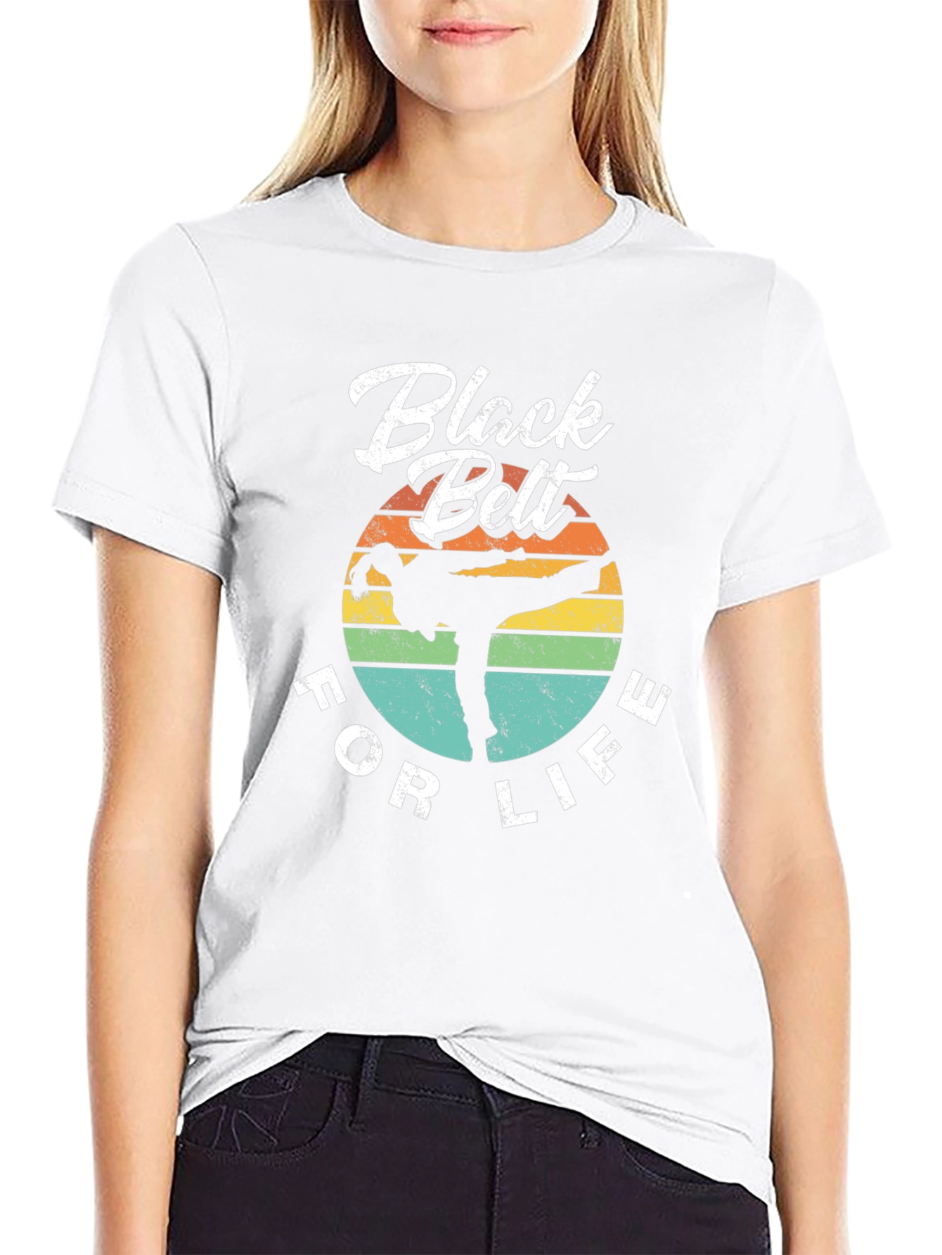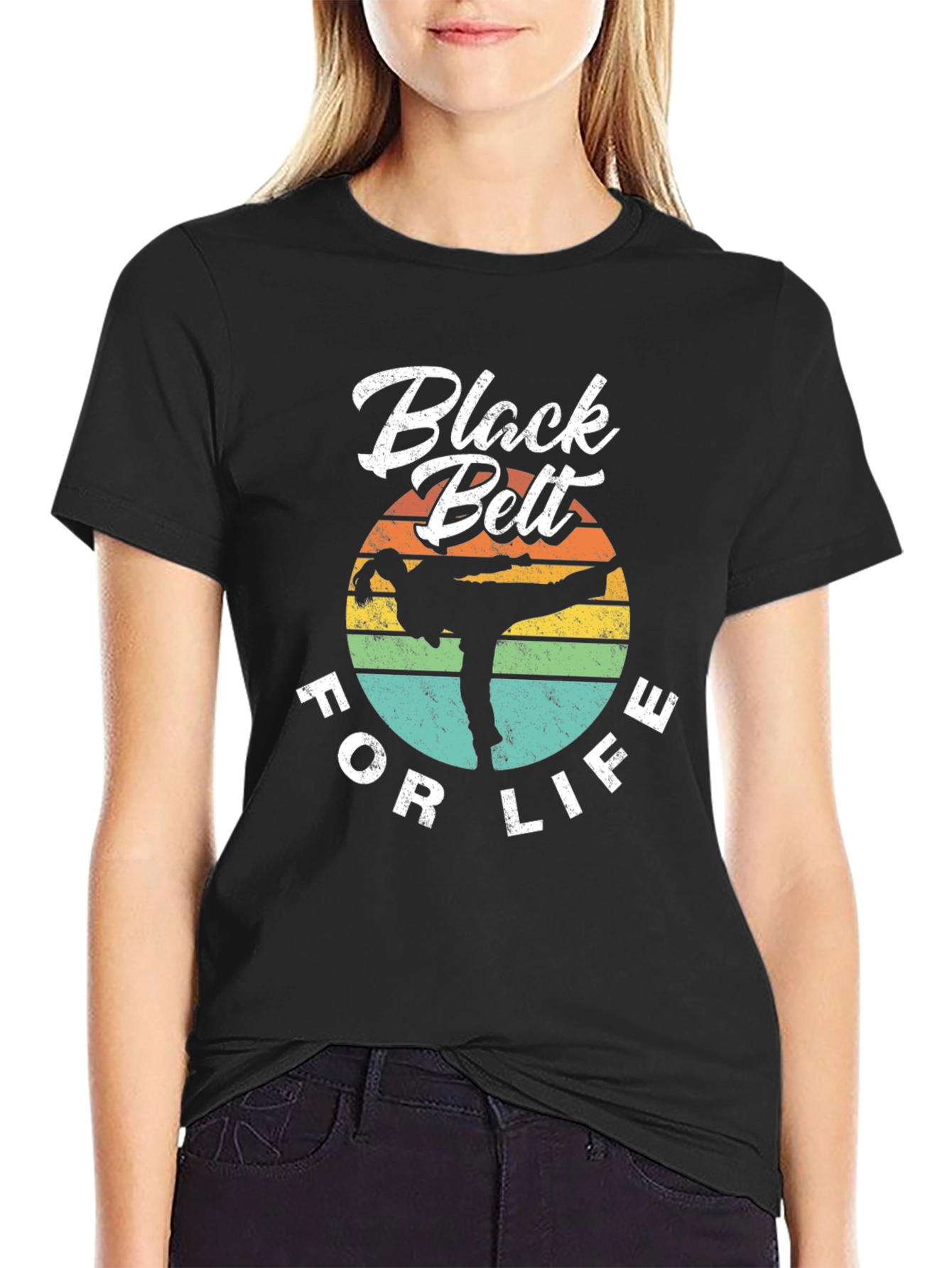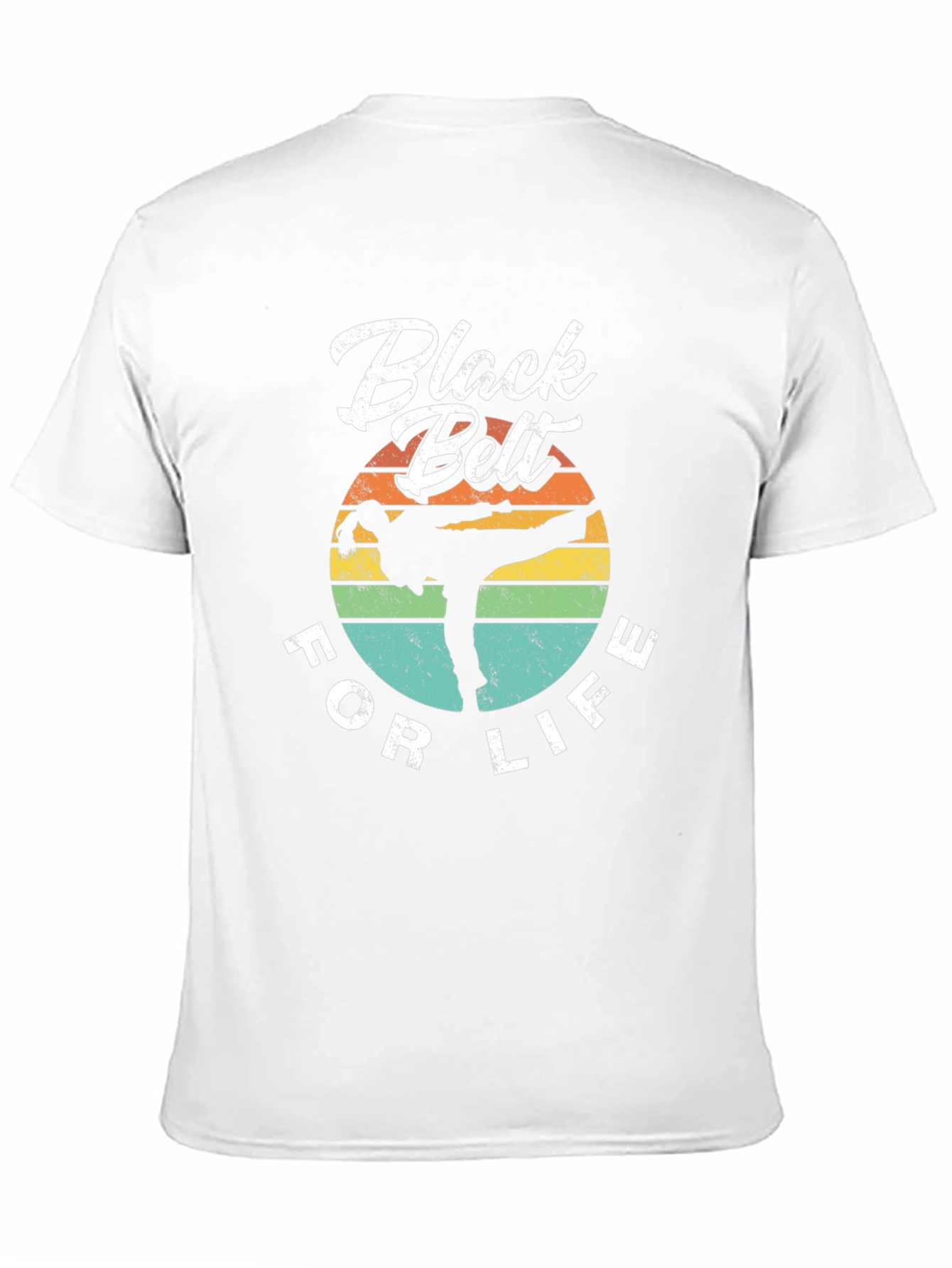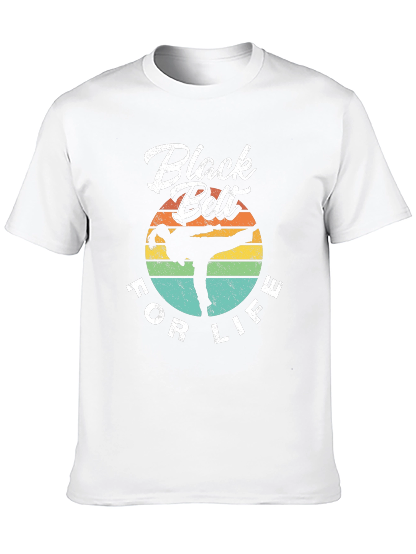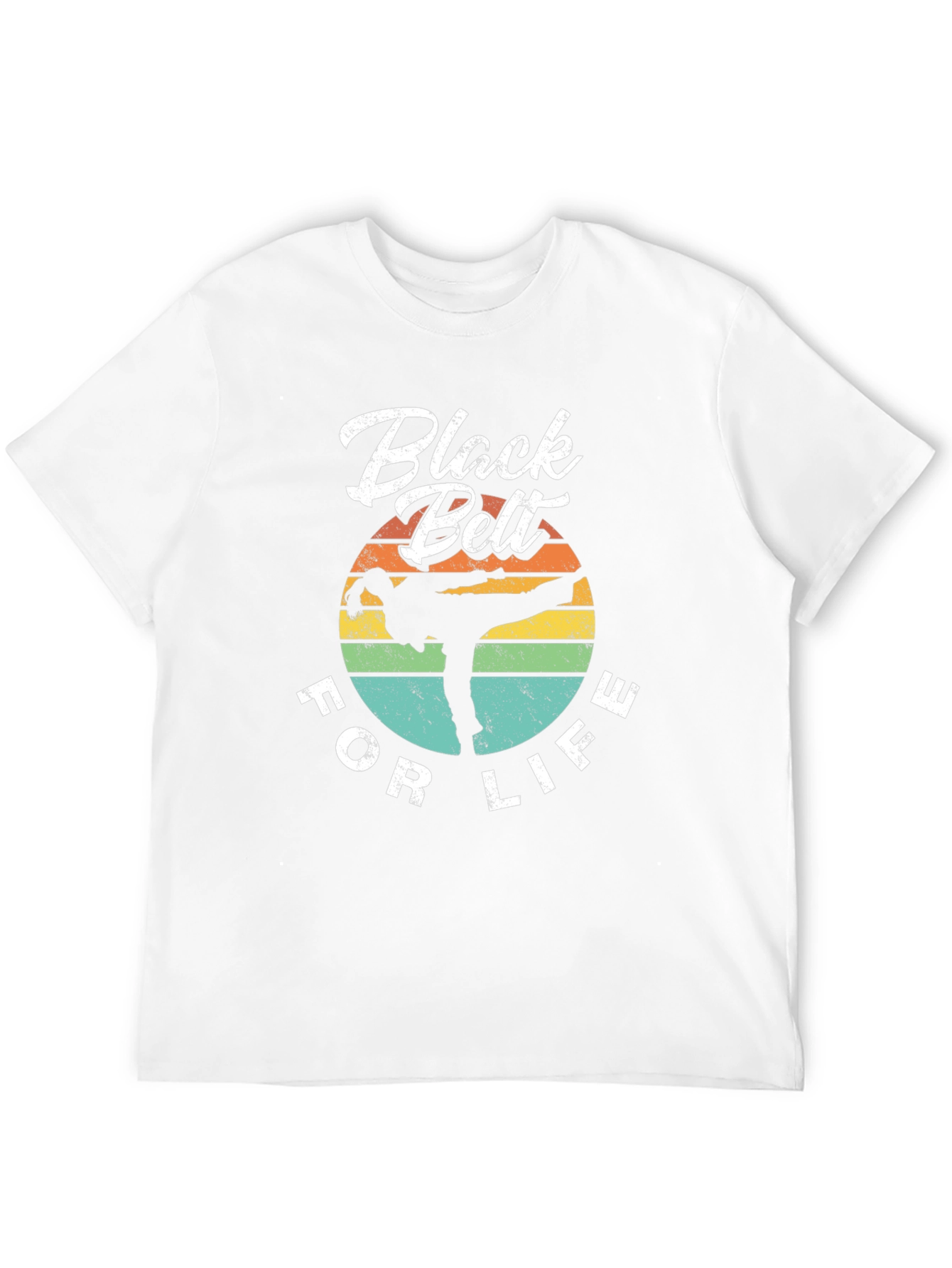 Show your dedication to martial arts with this "Black Belt For Life" T-shirt. The design features a silhouette of a martial artist in action, set against a retro-style sunset background with horizontal stripes in yellow, orange, green, and teal. The text "Black Belt" is printed in a bold, stylized font at the top, with "FOR LIFE" curving along the bottom. Made from a comfortable black fabric, this tee is perfect for casual wear, training sessions, or showing off your passion for martial arts.