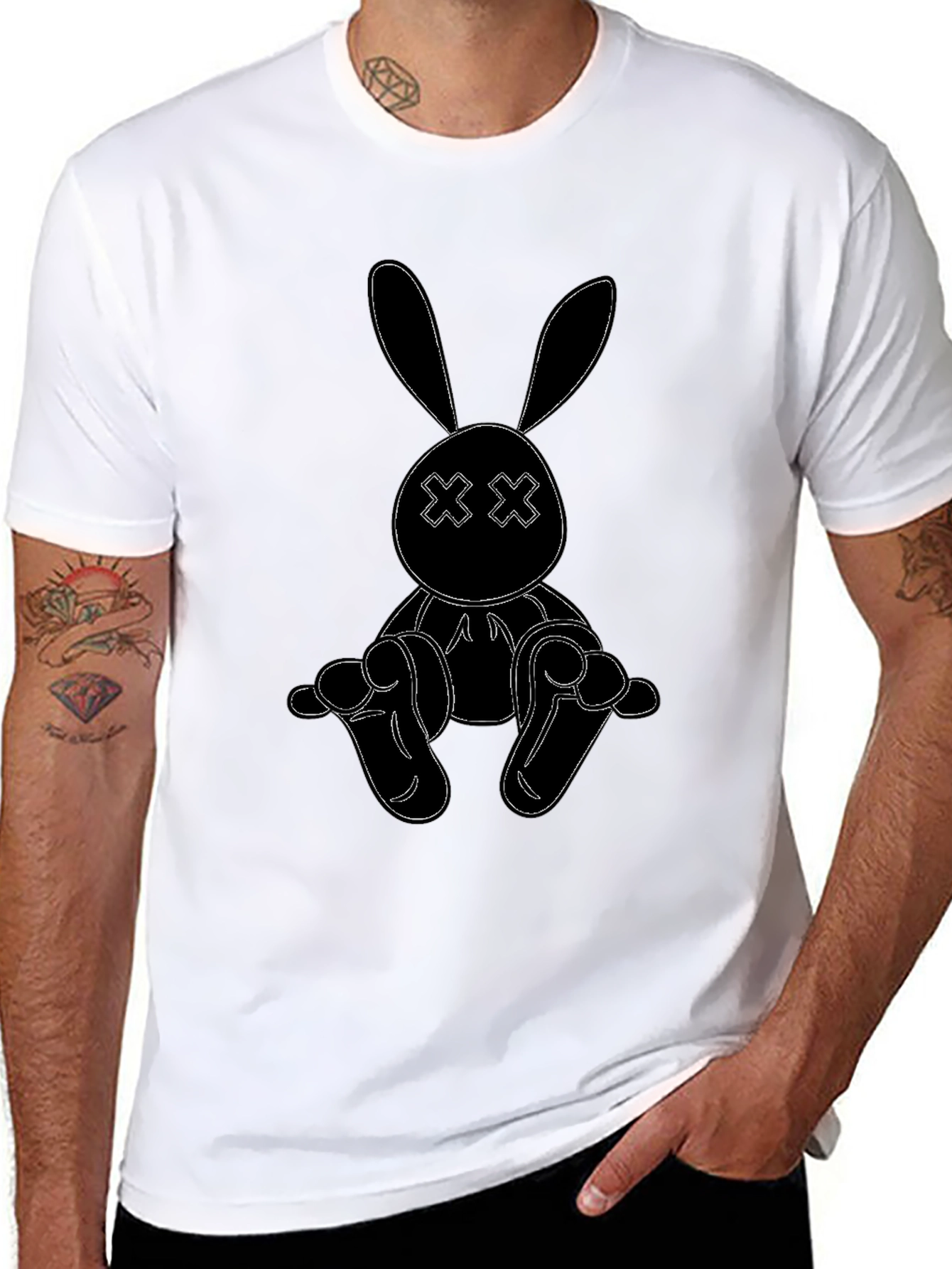 Show off your unique style with this eye-catching black t-shirt. The shirt features a minimalist outline graphic of a bunny with 'X' eyes, giving it a quirky and edgy vibe. Made from a comfortable, breathable fabric, this tee is perfect for everyday wear. Pair it with jeans or shorts for a casual look or dress it up with a blazer for a night out. Its simple yet striking design makes it a versatile addition to any wardrobe. Grab yours today and express your individuality!