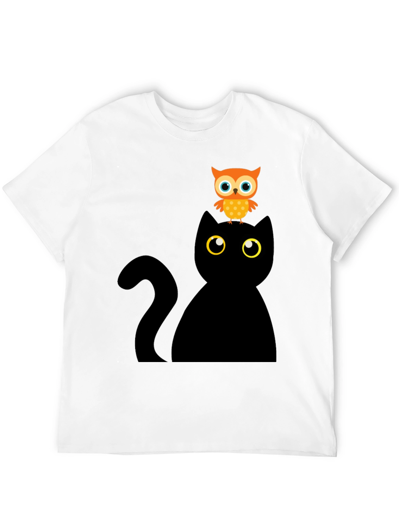 This striking black t-shirt features a unique and playful graphic design. A sleek, silhouetted black cat forms the base of the image, with a quirky orange owl perched jauntily on its head. The cat's large, bright yellow eyes add a touch of whimsy, while the owl's patterned body provides a pop of color. Made from a comfortable-looking material, this tee is perfect for casual wear. The bold graphic is sure to turn heads and spark conversations. Ideal for cat lovers, owl enthusiasts, or anyone who appreciates a touch of quirky style. Whether you're running errands, hanging out with friends, or just relaxing at home, this t-shirt is a fun and fashionable choice.