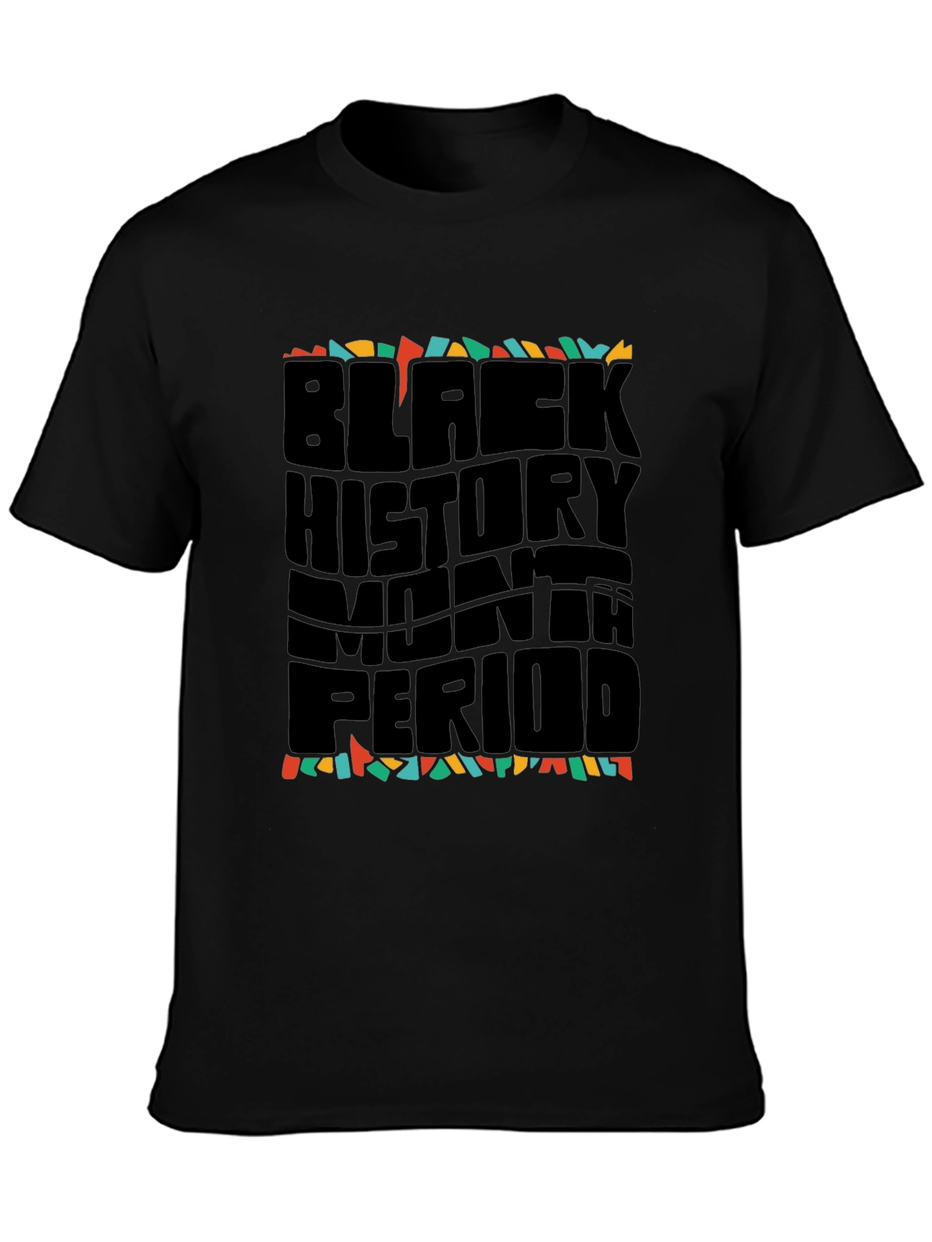 Celebrate Black History Month in style with this eye-catching graphic tee. The bold "Black History Month Period" design is sure to turn heads, while the comfortable fit makes it perfect for everyday wear. The text is designed in a unique way, and has a colorful abstract pattern bordering the top and the bottom of the text. Wear it with pride during Black History Month or any time of year to show your support and appreciation for black history and culture. Perfect for casual outings, events, or as a thoughtful gift.