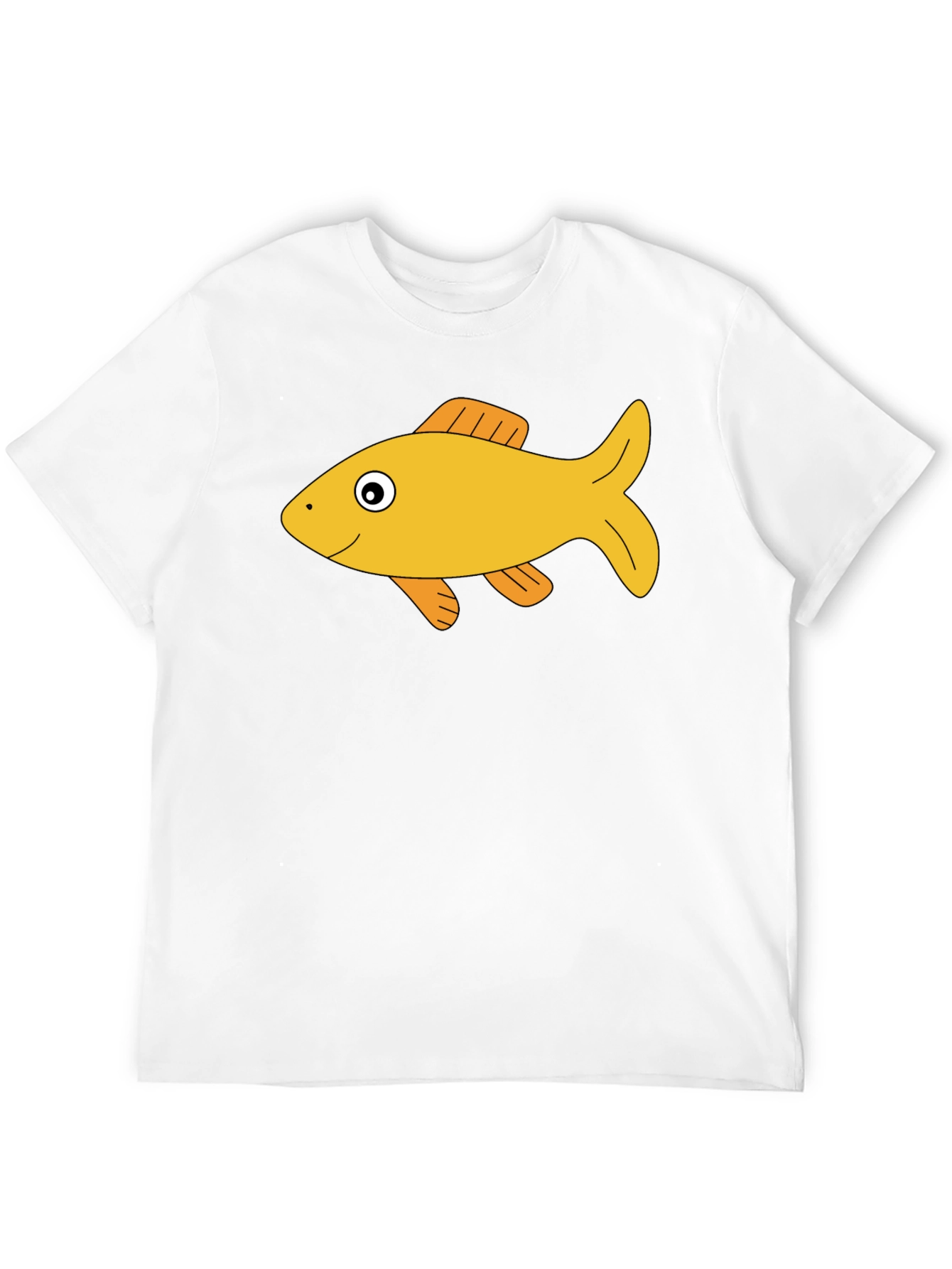 This black t-shirt features a vibrant, cartoon-style goldfish graphic. The goldfish is bright yellow with orange fins and a cheerful expression. Made from a comfortable-looking fabric, this shirt is perfect for casual wear. The classic black background makes the design pop, ensuring you'll stand out in style. It's a fun and playful addition to any wardrobe, ideal for everyday wear, casual outings, or as a unique conversation starter. Get ready to make a splash with this eye-catching tee!