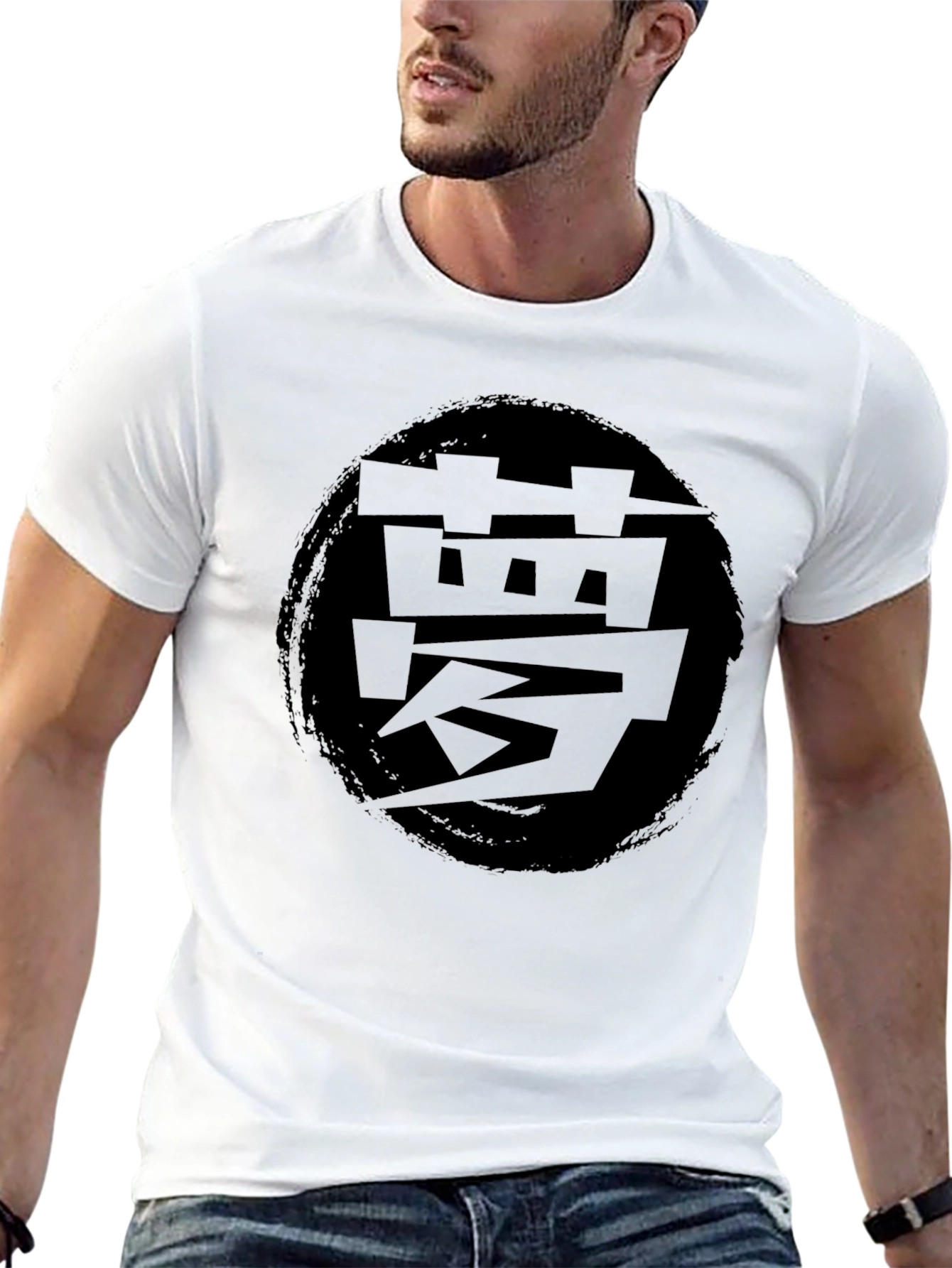 This stylish black t-shirt features a bold, circular design with a prominent Japanese symbol, possibly representing "dream" or a similar concept. The graphic has a slightly distressed, ink-like texture, adding to its unique appeal. Made from what appears to be a comfortable cotton blend, this shirt offers a relaxed fit that's perfect for casual wear. Ideal for those who appreciate minimalist designs, Japanese culture, or anyone looking for a standout everyday piece. Pair it with jeans or shorts for a cool, effortless look. The solid black color ensures versatility, making it easy to integrate into any wardrobe. The t-shirt showcases a fashionable and artistic aesthetic.