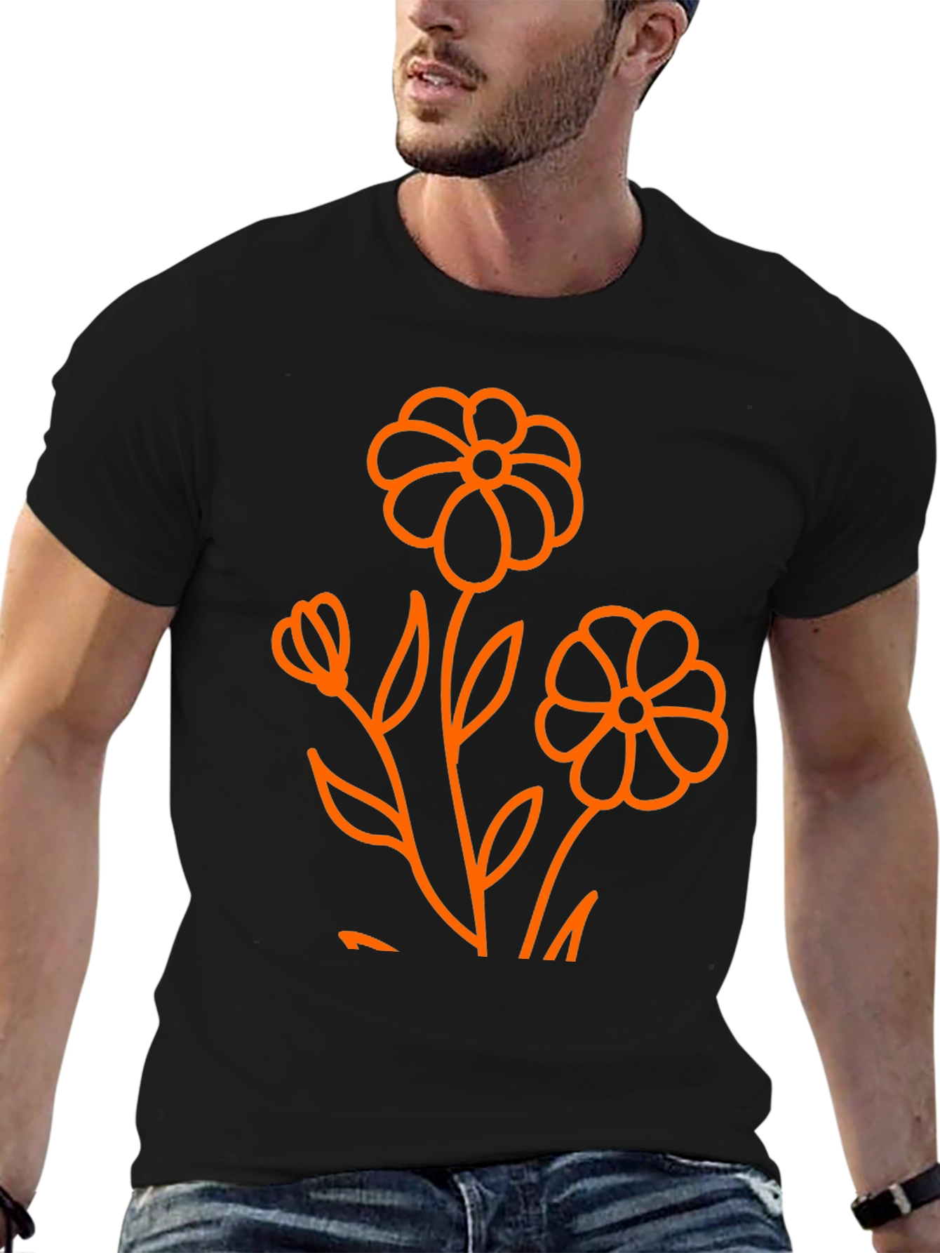 This classic black t-shirt features a striking orange floral design, perfect for adding a pop of color to your casual wardrobe. The shirt appears to be made from a comfortable, breathable fabric, likely cotton or a cotton blend, ensuring all-day wearability. The minimalist yet eye-catching floral graphic is stylish and versatile, making it easy to pair with jeans, shorts, or skirts. Ideal for everyday wear, casual outings, or as a fun statement piece, this t-shirt offers both comfort and effortless style. A must-have for any fashion-forward individual seeking a unique and expressive look.