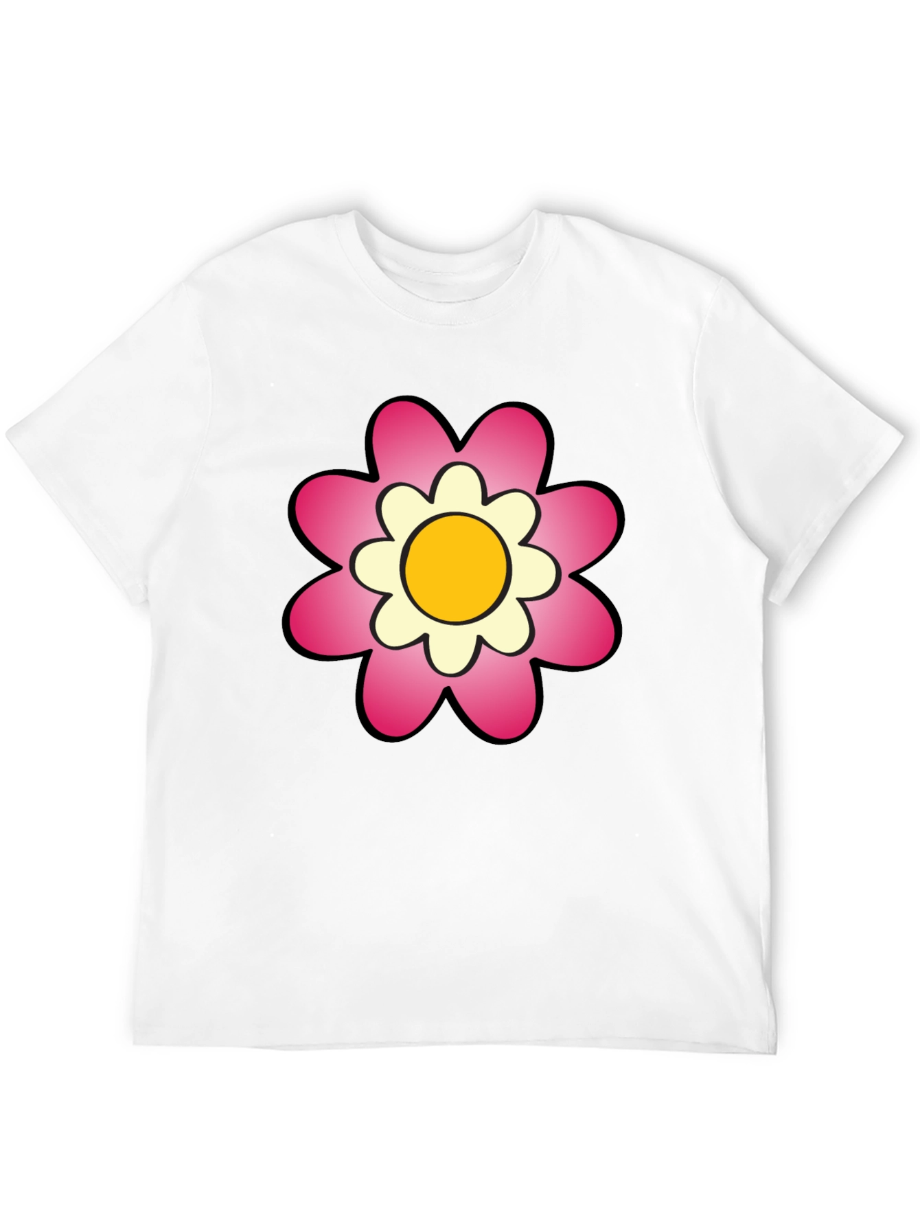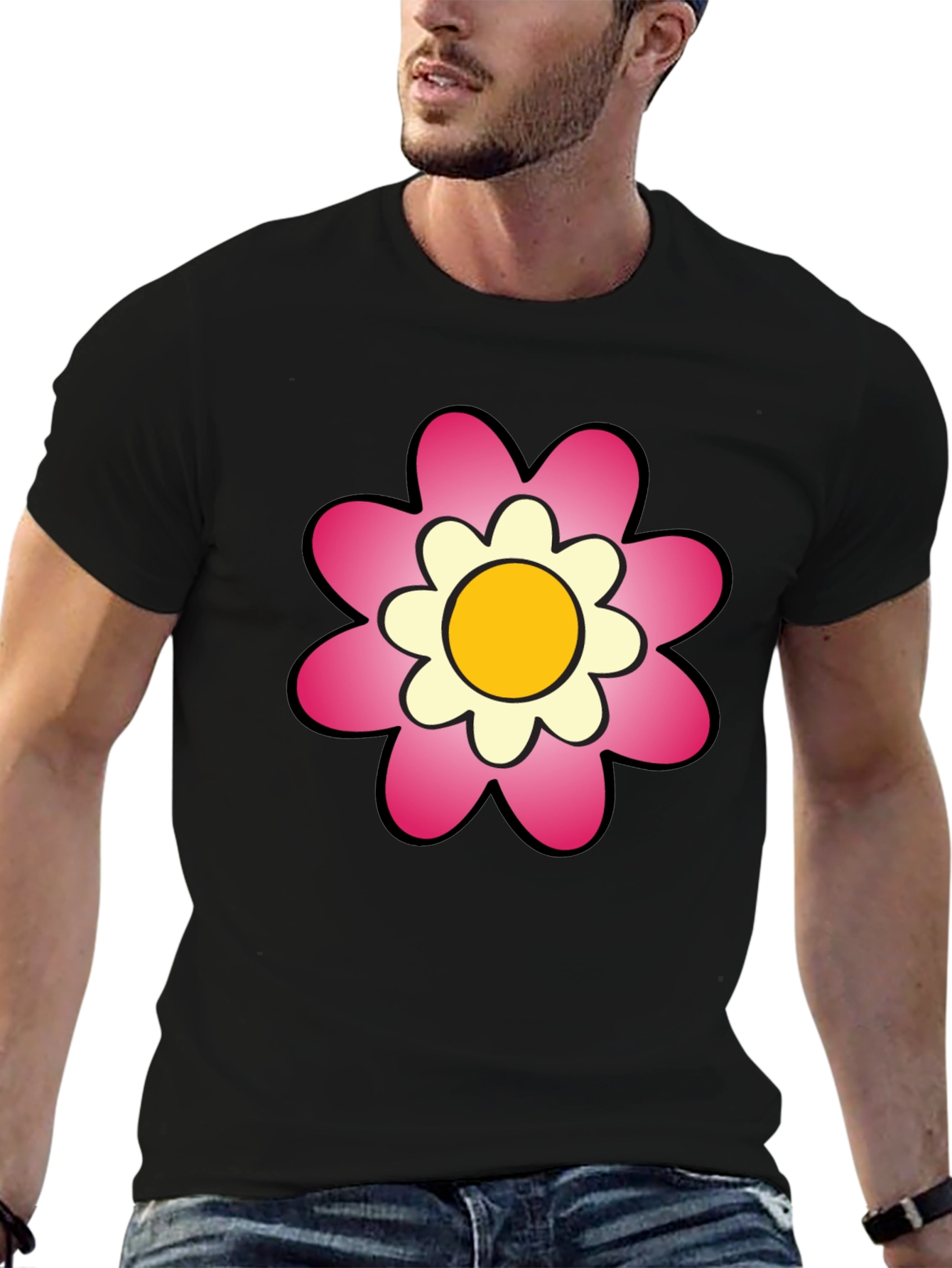This stylish black t-shirt features a vibrant pink flower graphic on the front, making it a fun and eye-catching addition to your wardrobe. The flower design includes a yellow center and light petals, adding a pop of color to the dark background. Made from a comfortable and breathable fabric, this t-shirt is perfect for casual everyday wear. Its classic fit ensures a relaxed and flattering look for all body types. Ideal for pairing with jeans, shorts, or skirts, this t-shirt is a versatile piece that can be dressed up or down for any occasion. Show off your unique sense of style with this trendy floral tee!