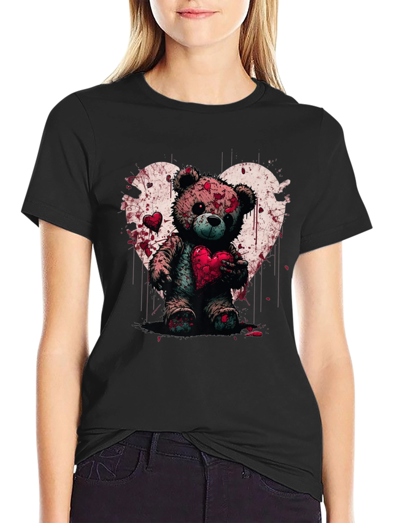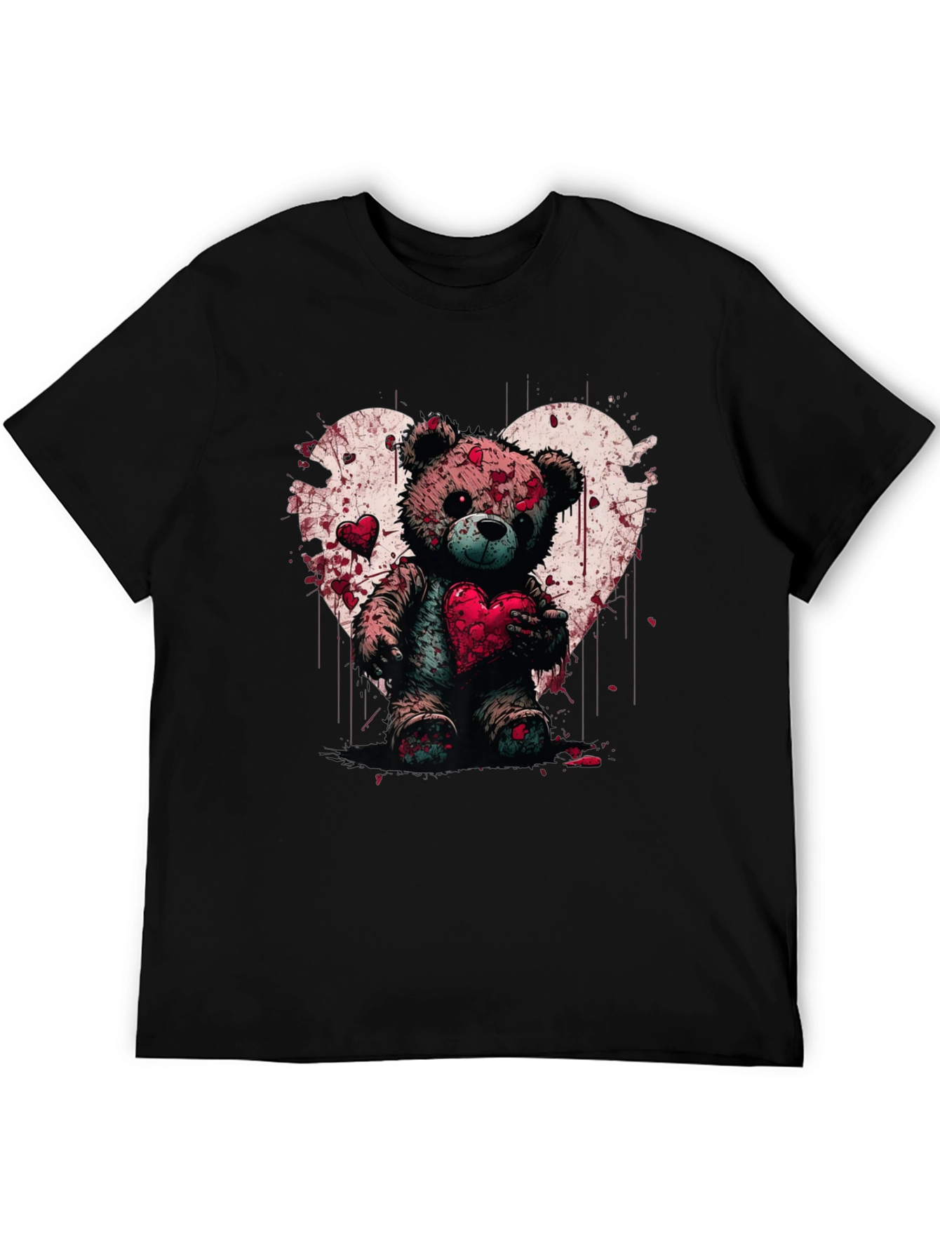 Express your unique style with this eye-catching graphic t-shirt! This black tee features a striking design of a teddy bear holding a heart, set against a grungy heart backdrop. The image is stylized with red spots creating a bloody-valentines theme. Made from what appears to be comfortable cotton fabric, this t-shirt is perfect for casual wear, making a statement, or adding a touch of edgy style to your everyday look. Ideal for those who appreciate alternative fashion, this shirt is sure to turn heads and spark conversation. Embrace your individuality with this bold and artistic piece.