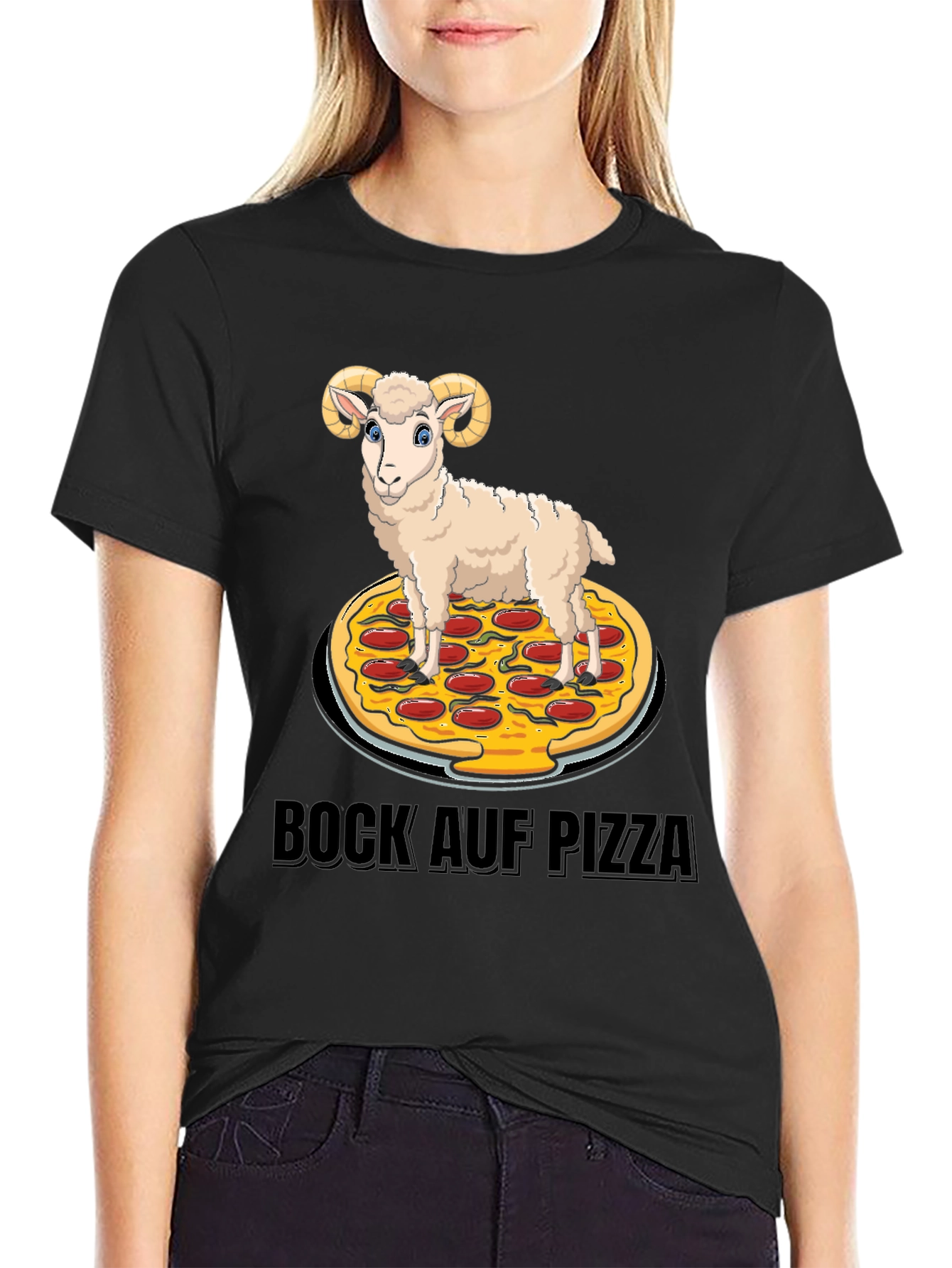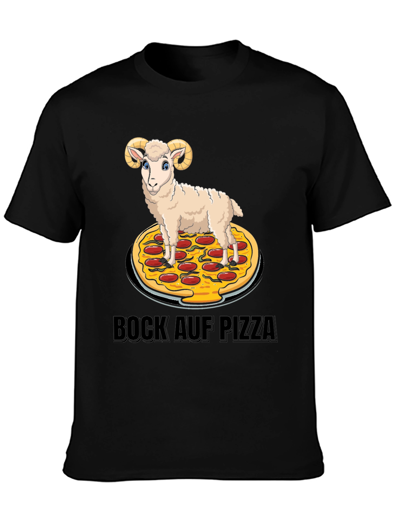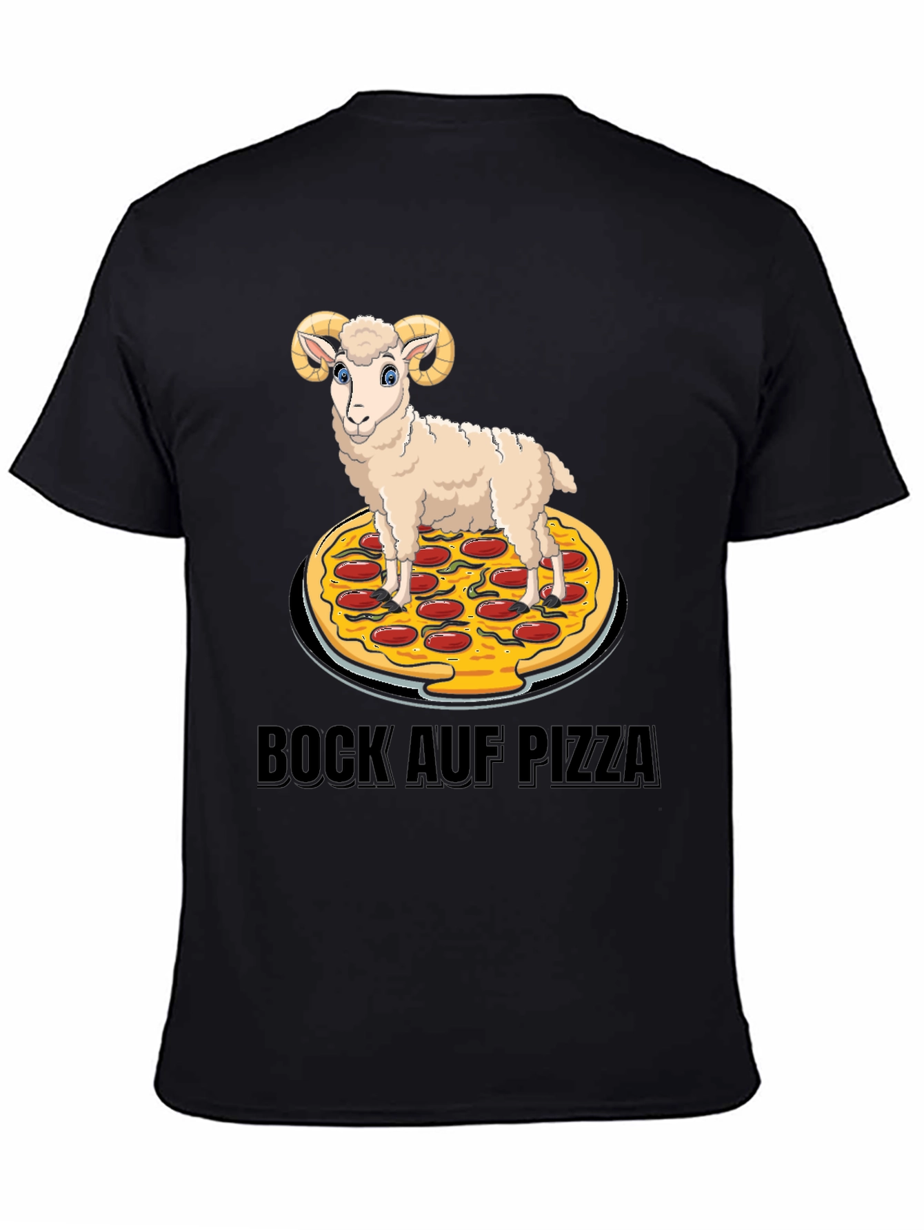 Indulge your cravings with this unique graphic tee! Featuring a whimsical design of a cartoon ram standing atop a delicious-looking pizza, this shirt is sure to turn heads and spark conversations. The playful 'Bock Auf Pizza' text adds a touch of humor. Made from comfortable black cotton fabric, this tee is perfect for casual wear, pizza nights, or anyone who loves a good laugh. It's a fun, stylish, and expressive way to show off your quirky personality and love for pizza.