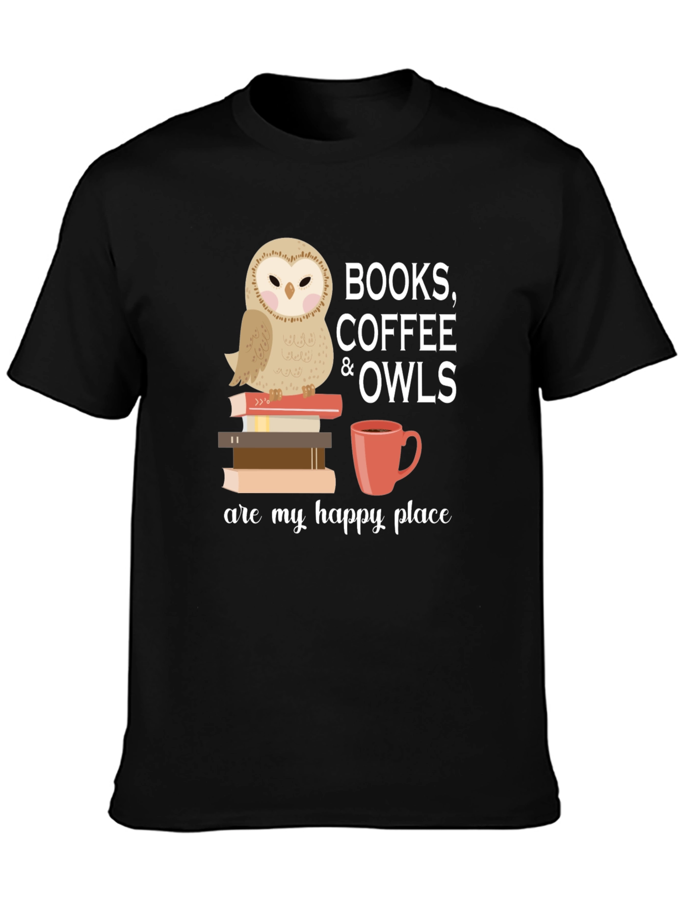 Express your love for reading, coffee, and owls with this adorable graphic t-shirt. The design features a cute owl perched on a stack of books, alongside a steaming mug of coffee and the phrase "Books, Coffee, & Owls are my happy place." Made from a soft, comfortable black fabric, this shirt is perfect for casual wear. Its playful design and cozy feel make it ideal for relaxing at home with a good book or meeting friends at your favorite cafe. A unique and fun addition to any book lover's wardrobe.