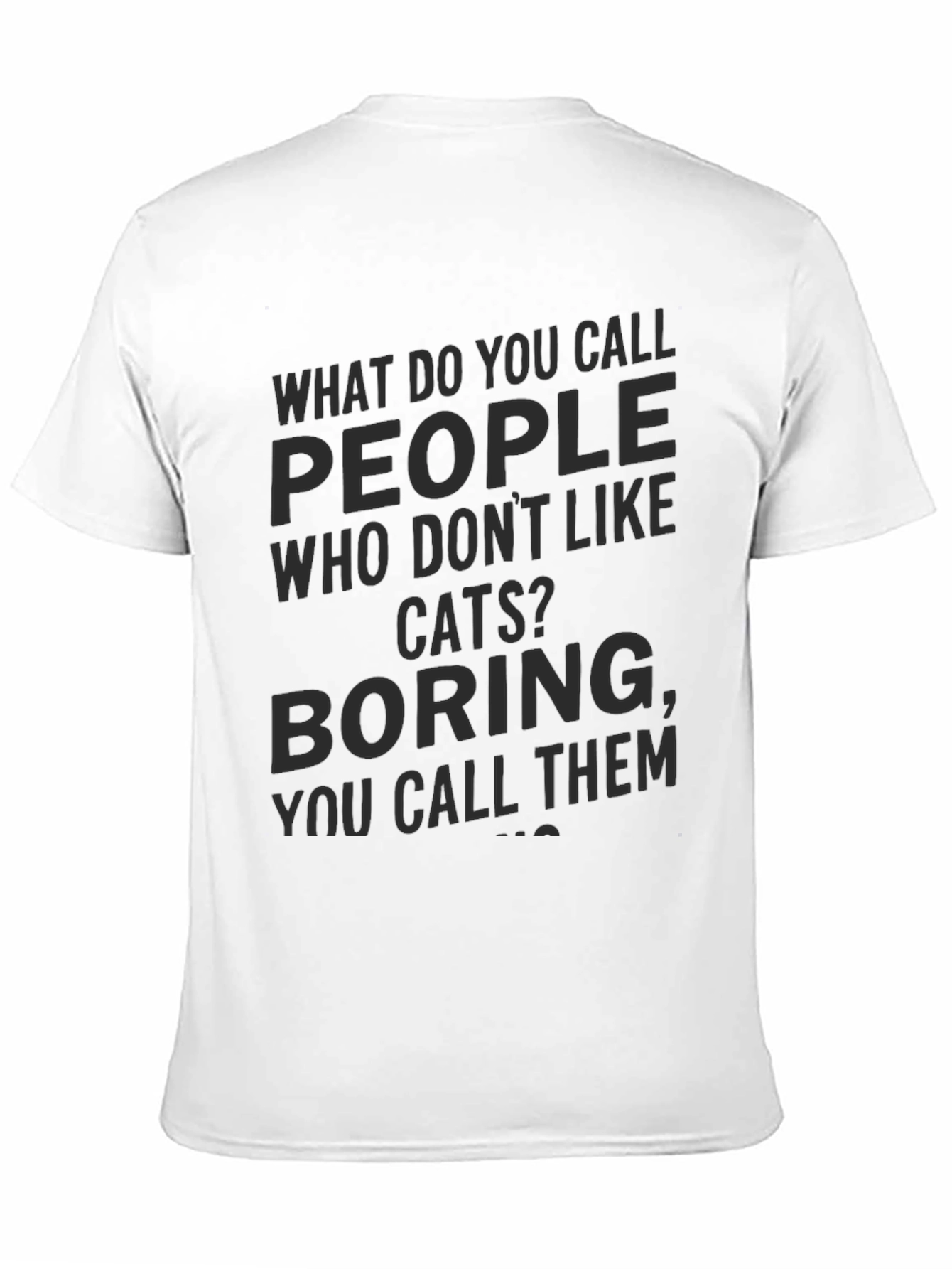 This classic black t-shirt features a humorous text design for cat lovers. The phrase "WHAT DO YOU CALL PEOPLE WHO DON'T LIKE CATS? BORING, YOU CALL THEM..." is printed prominently on the front. Made from a comfortable material, it's perfect for casual wear and expressing your affection for feline friends. The design is bold and eye-catching, making it a great conversation starter. Wear it to the park, a friend's house, or any casual outing. This shirt is a must-have for cat owners and fans looking to showcase their quirky side.