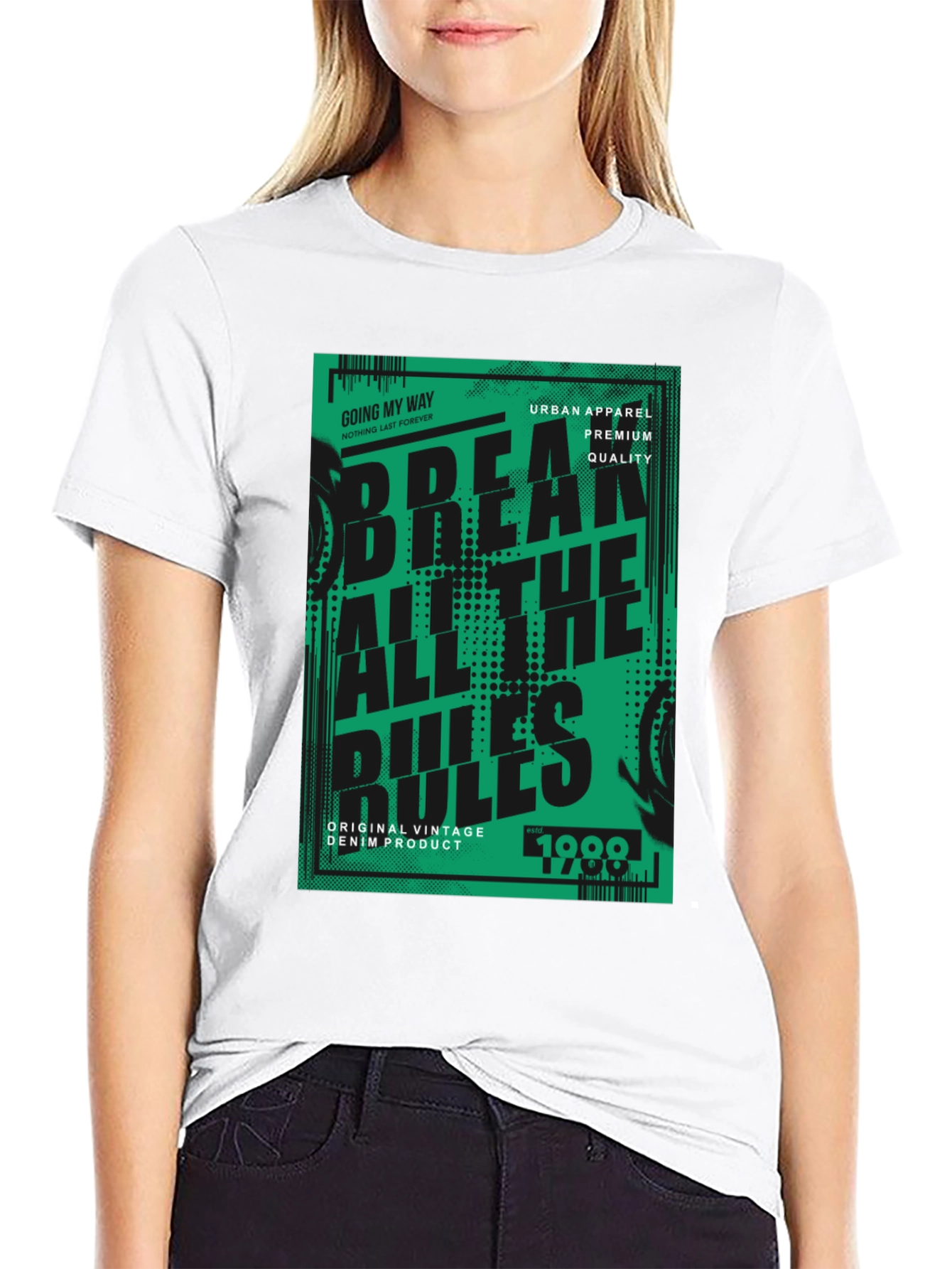 Make a statement with this eye-catching black t-shirt. The bold green graphic features a distressed, urban-inspired design with the words "Break All The Rules." The shirt's design includes artistic elements and text, suggesting a vintage or retro aesthetic. Constructed from comfortable materials, it's perfect for casual wear, expressing individuality, and making a bold statement. This tee is ideal for those who embrace originality and unconventional style. Pair it with jeans or shorts for an effortlessly cool look.