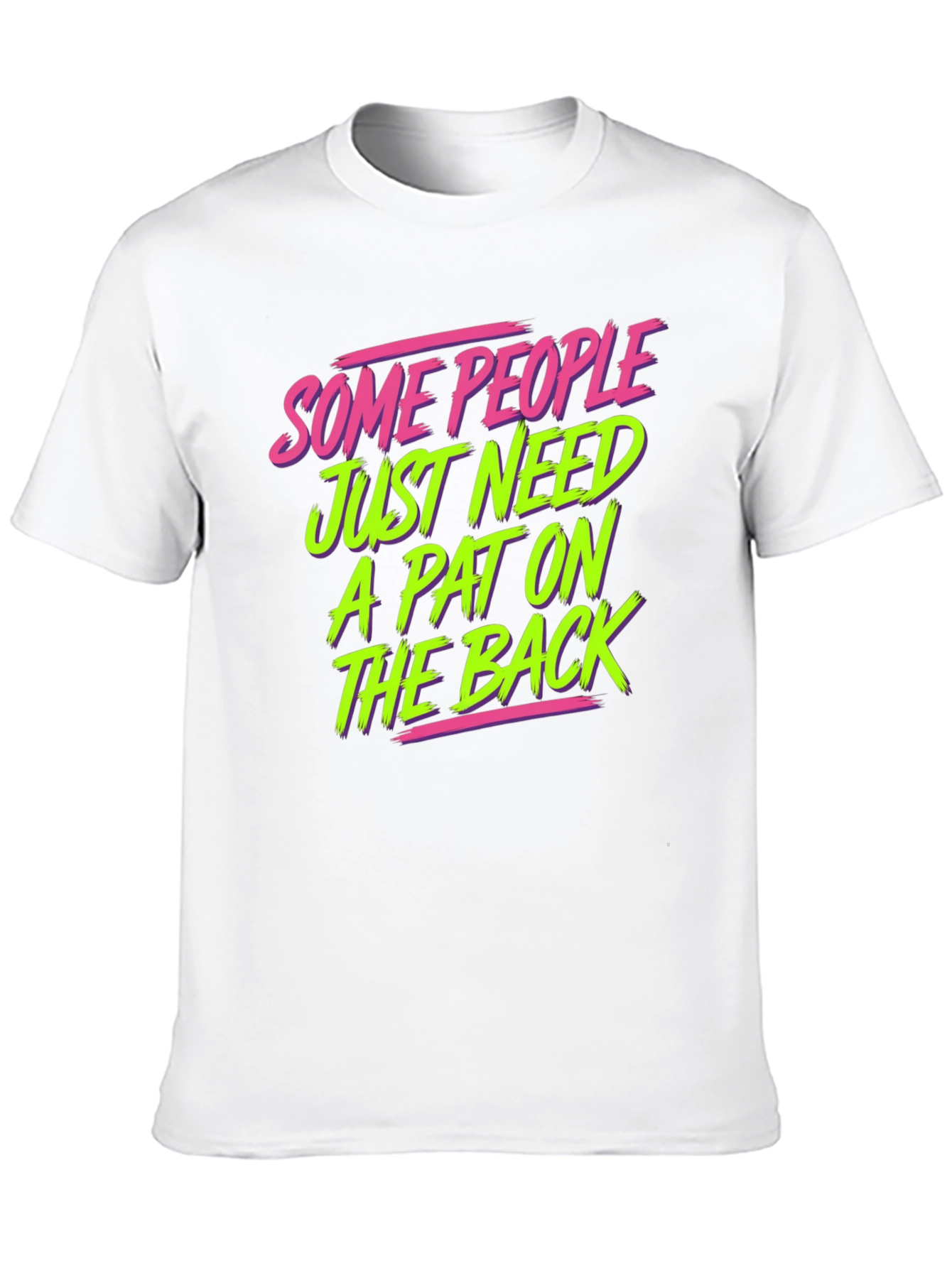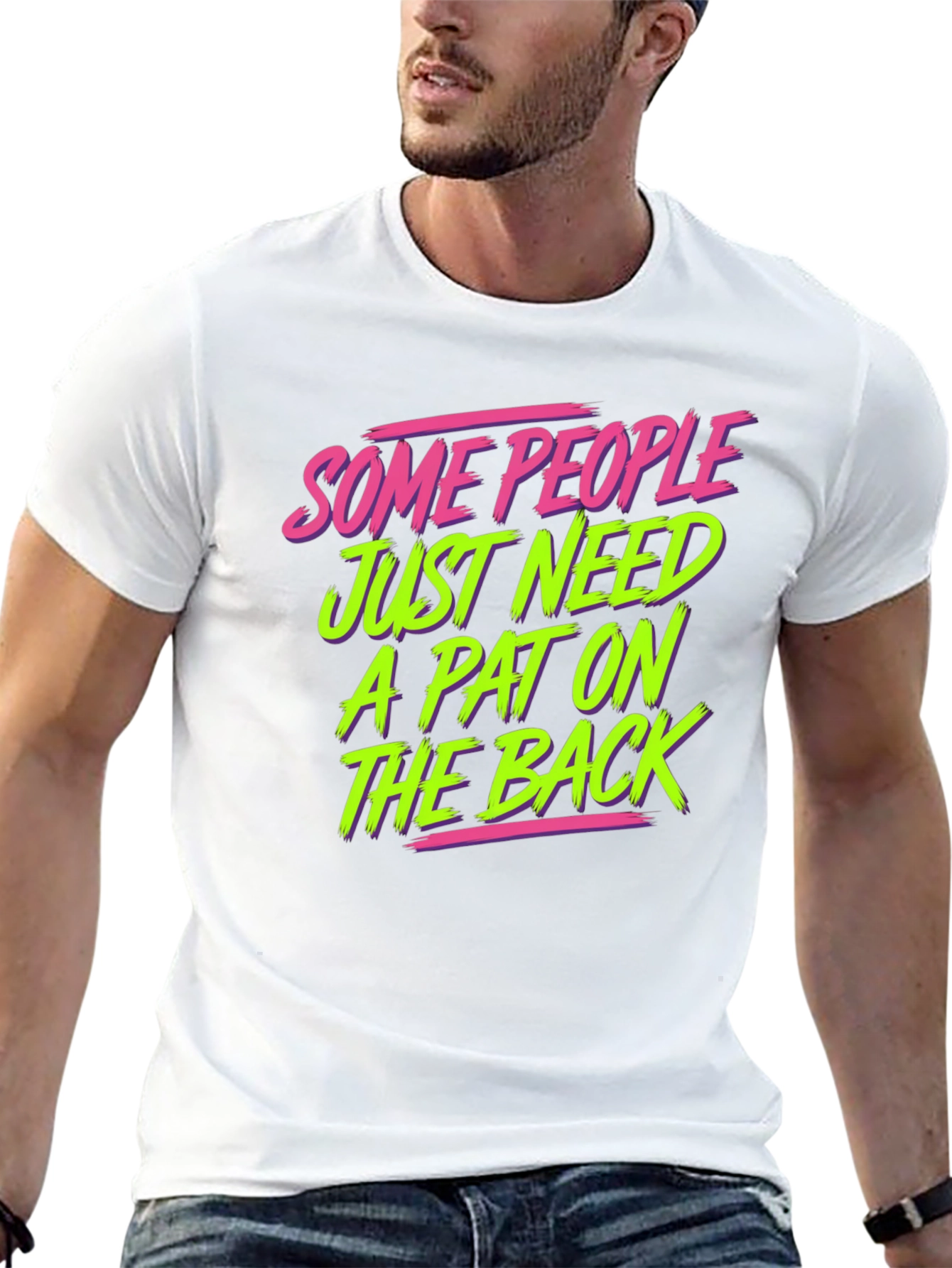 This eye-catching black t-shirt features a humorous graphic print in vibrant neon colors. The phrase "SOME PEOPLE JUST NEED A PAT ON THE BACK" is prominently displayed across the chest. The bright pink and green lettering adds a bold and playful touch. Made from a comfortable-looking fabric, this tee is ideal for casual wear, making a statement, or sparking conversations. Perfect for those with a sense of humor, this shirt is a fun addition to any wardrobe. Wear it to parties, casual outings, or just lounging around. It's sure to get a laugh!