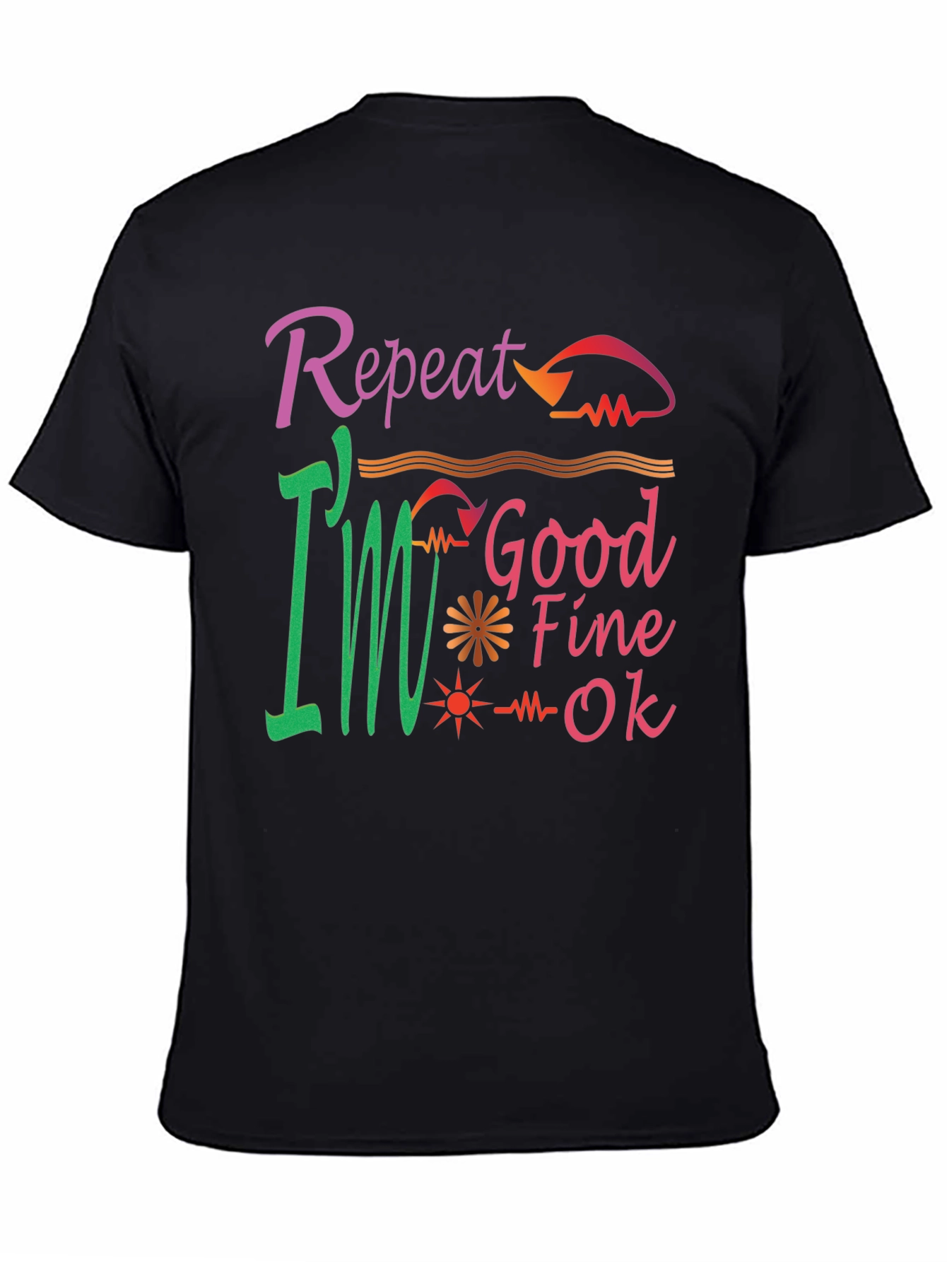 This black t-shirt features a whimsical, colorful design that adds a playful touch to your wardrobe. The shirt playfully states "Repeat I'm Good Fine OK", designed with a mix of vibrant colors and quirky graphics including a sun, a flower, and wavy lines. Perfect for casual outings, the tee is a conversation starter and a comfortable statement piece. Crafted from a soft-looking fabric, this tee ensures a relaxed fit and all-day comfort. It's a great addition to any casual ensemble.