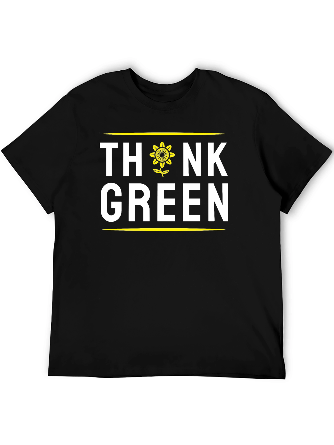Show your love for nature with this stylish black graphic t-shirt. The design features the phrase 'Think Green' in bold, white lettering, accented with yellow horizontal lines. A detailed sunflower graphic replaces the 'O' in 'Think', adding a touch of nature-inspired flair. This tee is perfect for everyday wear, casual outings, or expressing your eco-conscious mindset. The classic fit and soft fabric ensure all-day comfort, making it a versatile addition to any wardrobe. Made with quality materials, this t-shirt offers both style and durability, so you can wear your values with confidence.