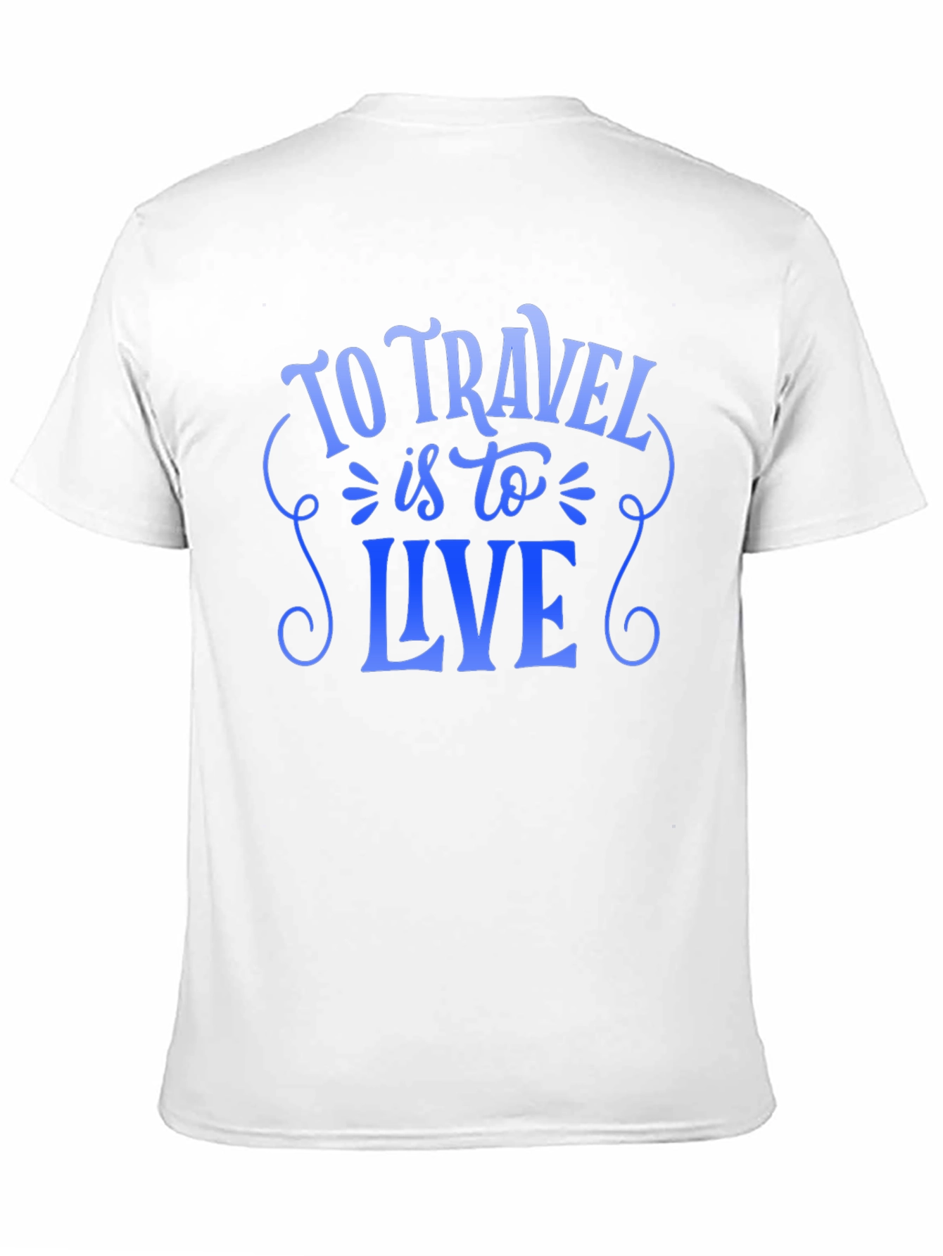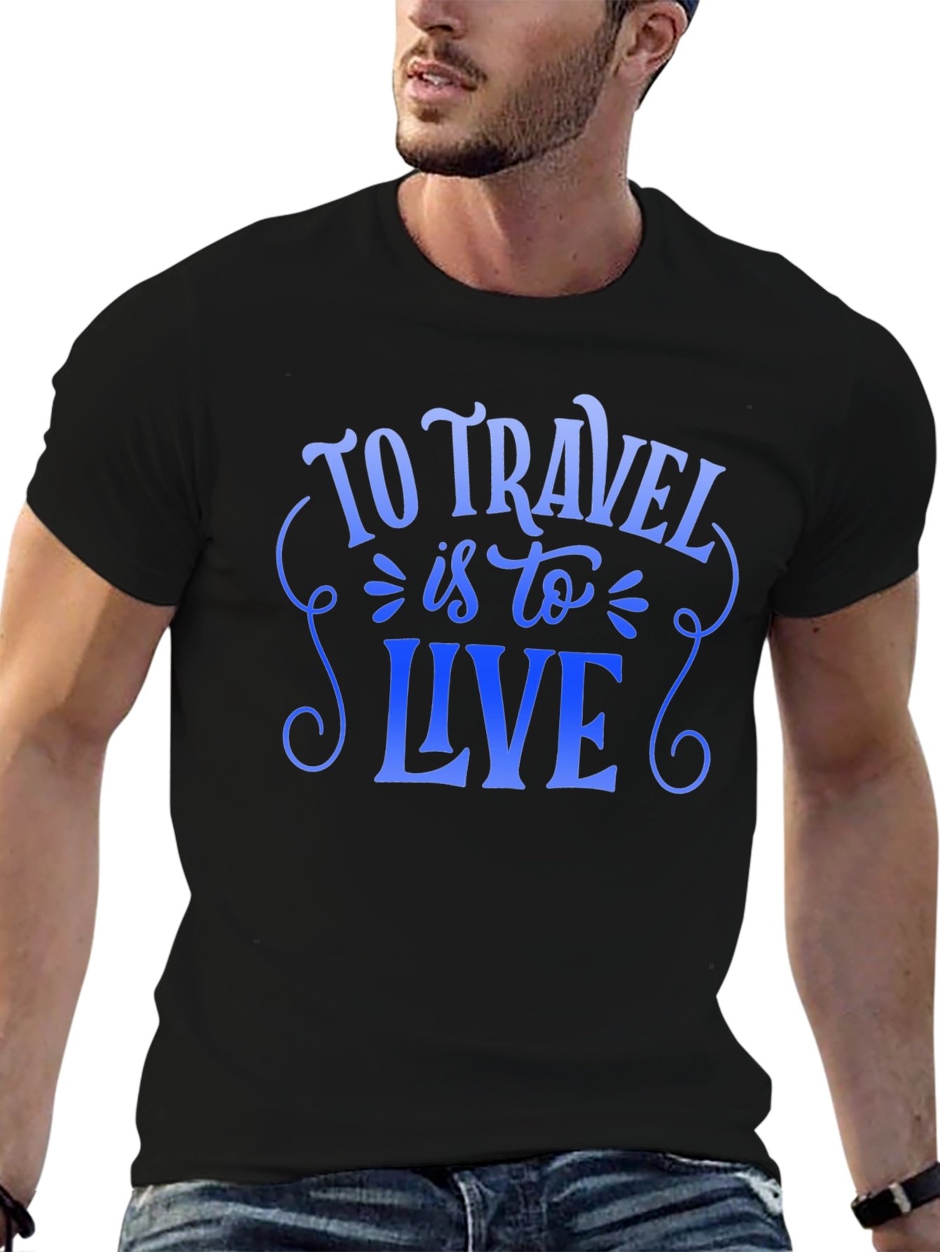 Embrace your wanderlust with this stylish black t-shirt. The shirt features a vibrant blue graphic that reads "To Travel is to Live," inspiring adventure and exploration. Made from a soft, comfortable fabric, this tee is perfect for everyday wear or your next globetrotting adventure. The eye-catching design is sure to turn heads and spark conversations. Whether you're hitting the road or simply dreaming of your next vacation, this t-shirt is a must-have for any travel enthusiast. Pair it with jeans, shorts, or a skirt for a casual and trendy look. Get yours today and wear your passion for travel with pride!
