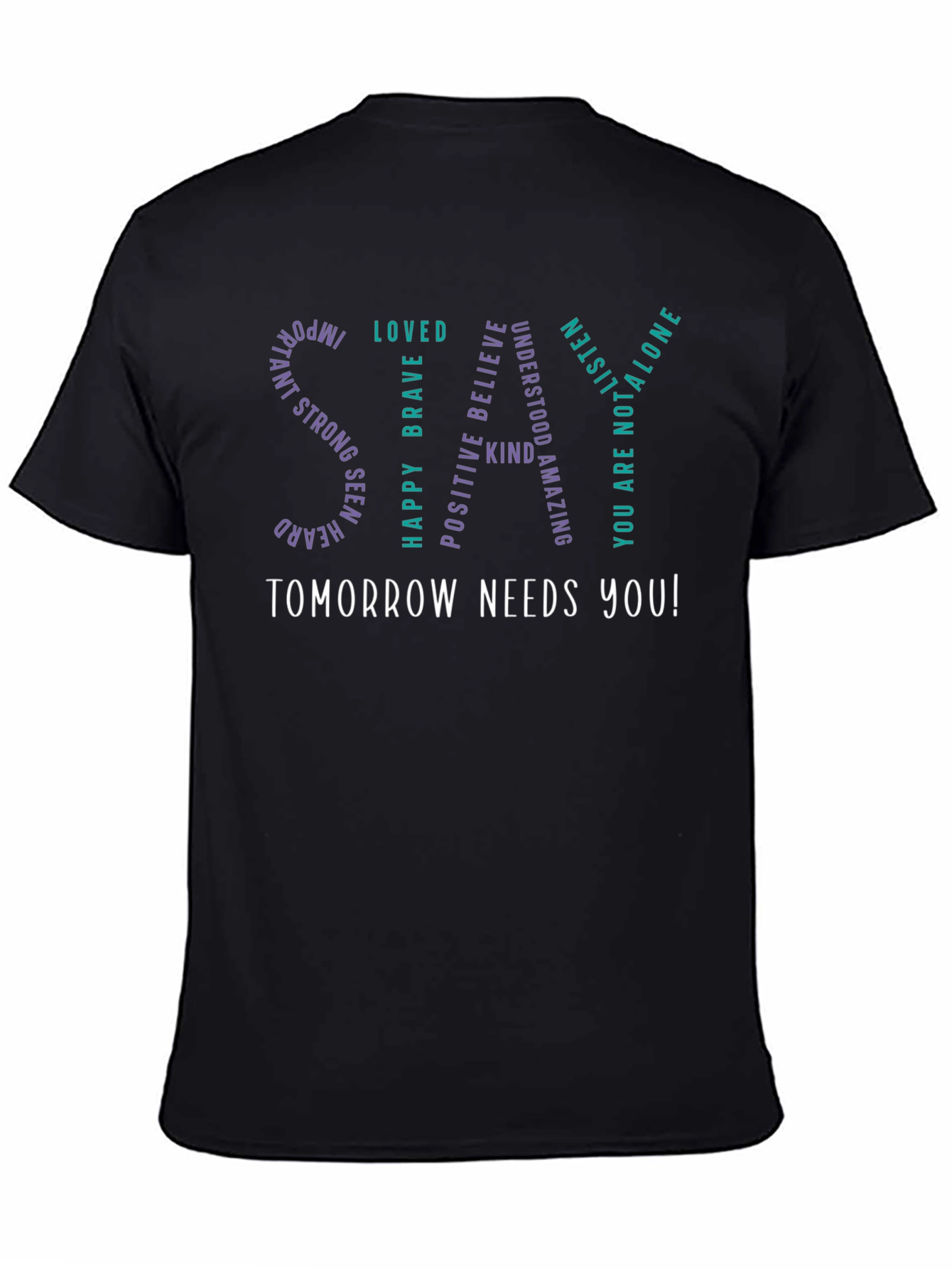 This classic black t-shirt features an impactful message, designed to uplift and inspire. Vertical text spells out 'STAY', each letter is accompanied with supportive words and phrases such as 'Important, Strong, Seen, Heard', 'Loved, Happy, Brave' and 'Positive, Believe, Kind' . The text 'Tomorrow Needs You!' is printed in white beneath the design. This tee is perfect for everyday wear. Made from comfortable materials, it offers a relaxed fit and timeless style. Wear it to spread positivity, spark conversations, and remind yourself and others of their inherent worth.