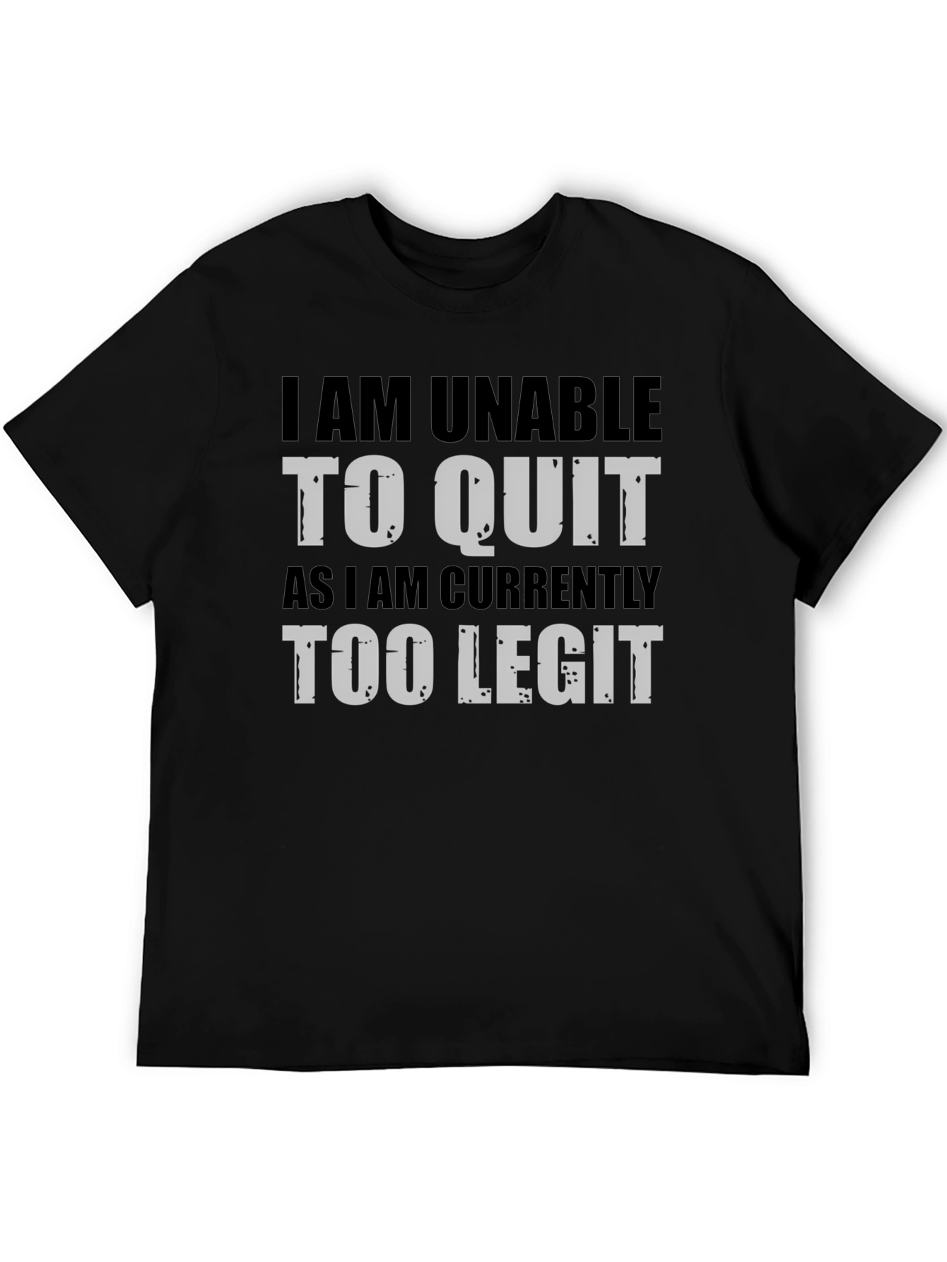 This black t-shirt features a humorous graphic design that reads: "I AM UNABLE TO QUIT AS I AM CURRENTLY TOO LEGIT." The bold, distressed lettering gives it a modern, edgy look. Made from what appears to be a soft, breathable cotton blend, this tee offers both comfort and style. It's a great conversation starter and a fun way to express your determination and confidence. Perfect for casual wear, gym sessions, or any situation where you want to make a statement. Show off your playful side with this unique and comfortable t-shirt.