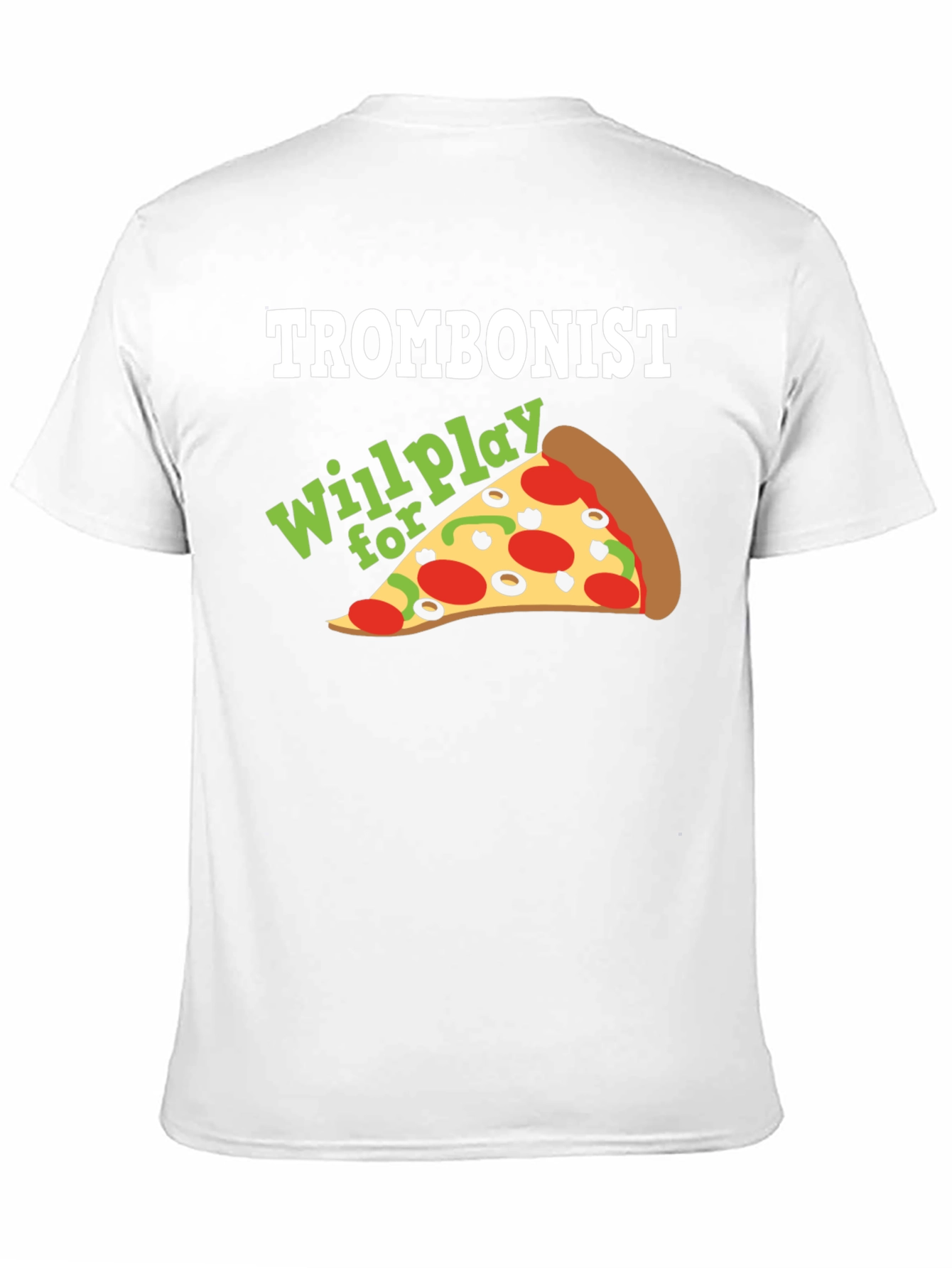 This fun black t-shirt features a playful graphic, perfect for musicians with a sense of humor. The design showcases the word "Trombonist" above a vibrant cartoon pizza slice, accompanied by the phrase "Will Play for Pizza" in a bold green font. Made from what appears to be a soft and comfortable cotton blend, this tee is ideal for casual wear, music rehearsals, or band performances. It's a great conversation starter and a unique way to show off your love for both music and pizza. Perfect as a gift for the trombonist in your life!