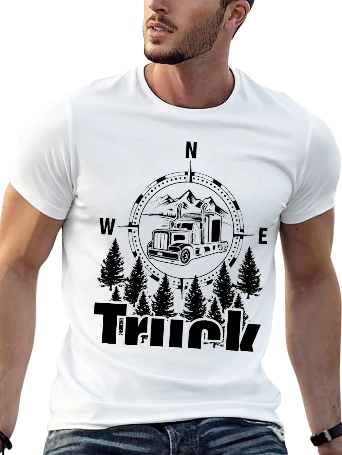 Show your love for trucking with this stylish black t-shirt. It features a unique compass design with a semi-truck illustration set against a mountain backdrop. The design incorporates pine trees and the word "Truck" in bold letters. Perfect for everyday wear, this tee combines comfort and style for truck enthusiasts.