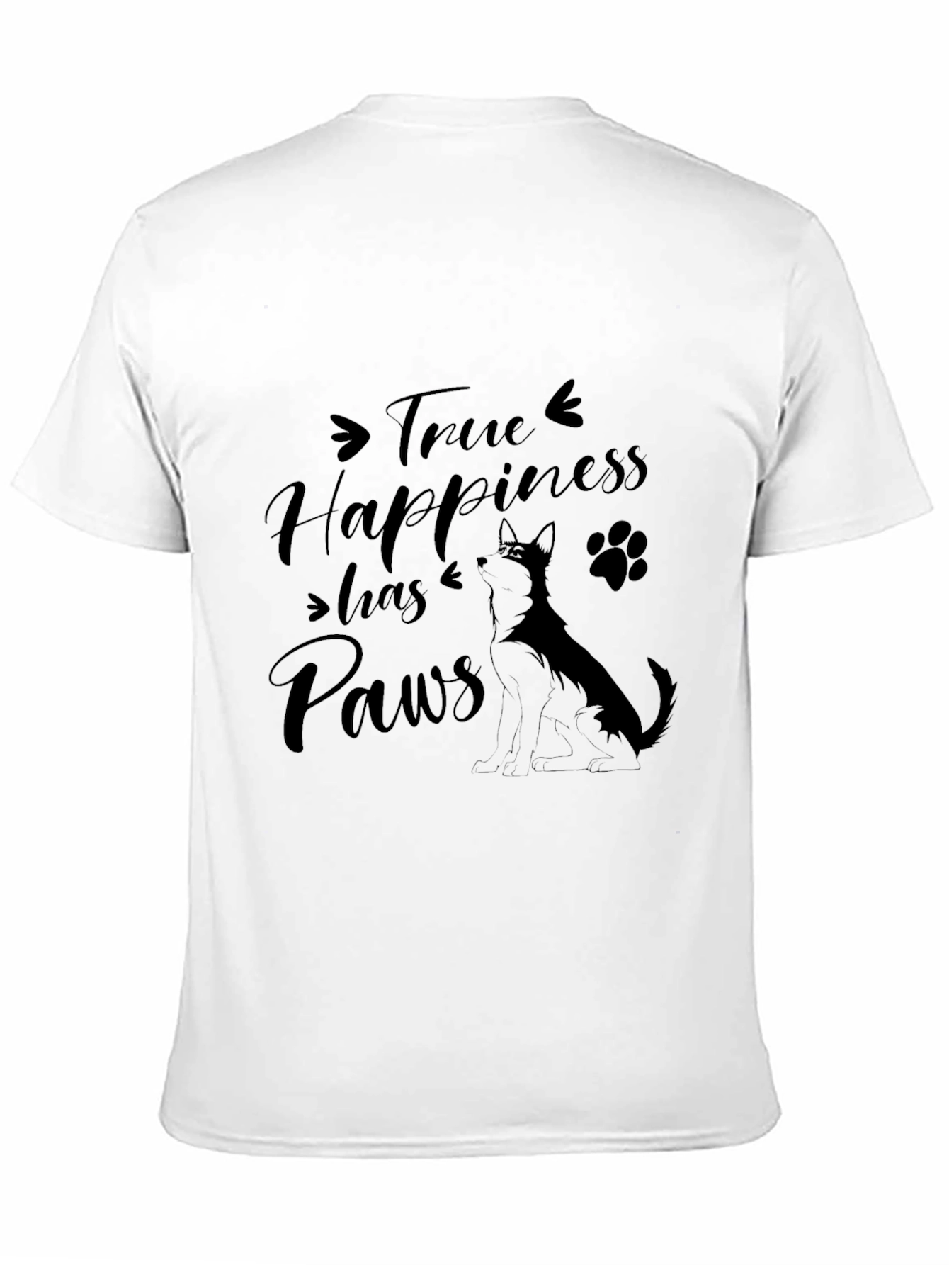 Show your love for dogs with this stylish black T-shirt. Features a cute graphic design with the phrase "True Happiness Has Paws", accompanied by a dog silhouette and paw print. Made from comfortable material, this T-shirt is perfect for casual wear, dog walks, or just lounging around at home. Express your passion for furry friends with this unique and eye-catching design. A perfect gift for dog owners!