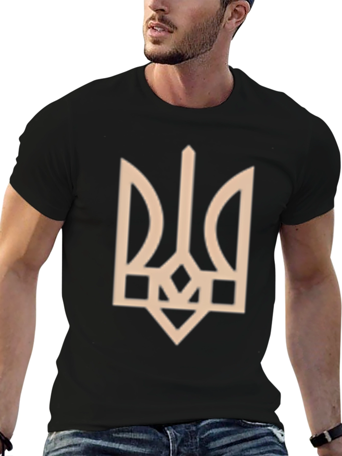 Show your support for Ukraine with this stylish black t-shirt featuring a prominent Ukrainian Trident (Tryzub) design. The emblem is printed in a light tan color, creating a striking contrast against the dark fabric. Made from what appears to be a soft and comfortable cotton blend, this tee is perfect for everyday wear. The classic fit makes it suitable for a wide range of body types. Wear it to rallies, cultural events, or simply as a statement of solidarity. A great way to demonstrate your connection to Ukrainian heritage and resilience.