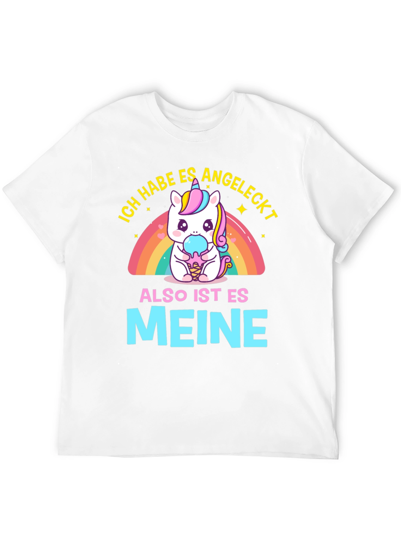 Show off your fun side with this black t-shirt featuring a cute cartoon unicorn eating ice cream under a rainbow! The German text, 'Ich habe es angeleckt also ist es meine', translates to 'I licked it so it's mine', adding a playful twist. Made from comfortable fabric, this tee is perfect for casual wear, parties, or gifting to unicorn lovers with a sense of humor. Get ready to turn heads and spark conversations with this unique and trendy t-shirt!