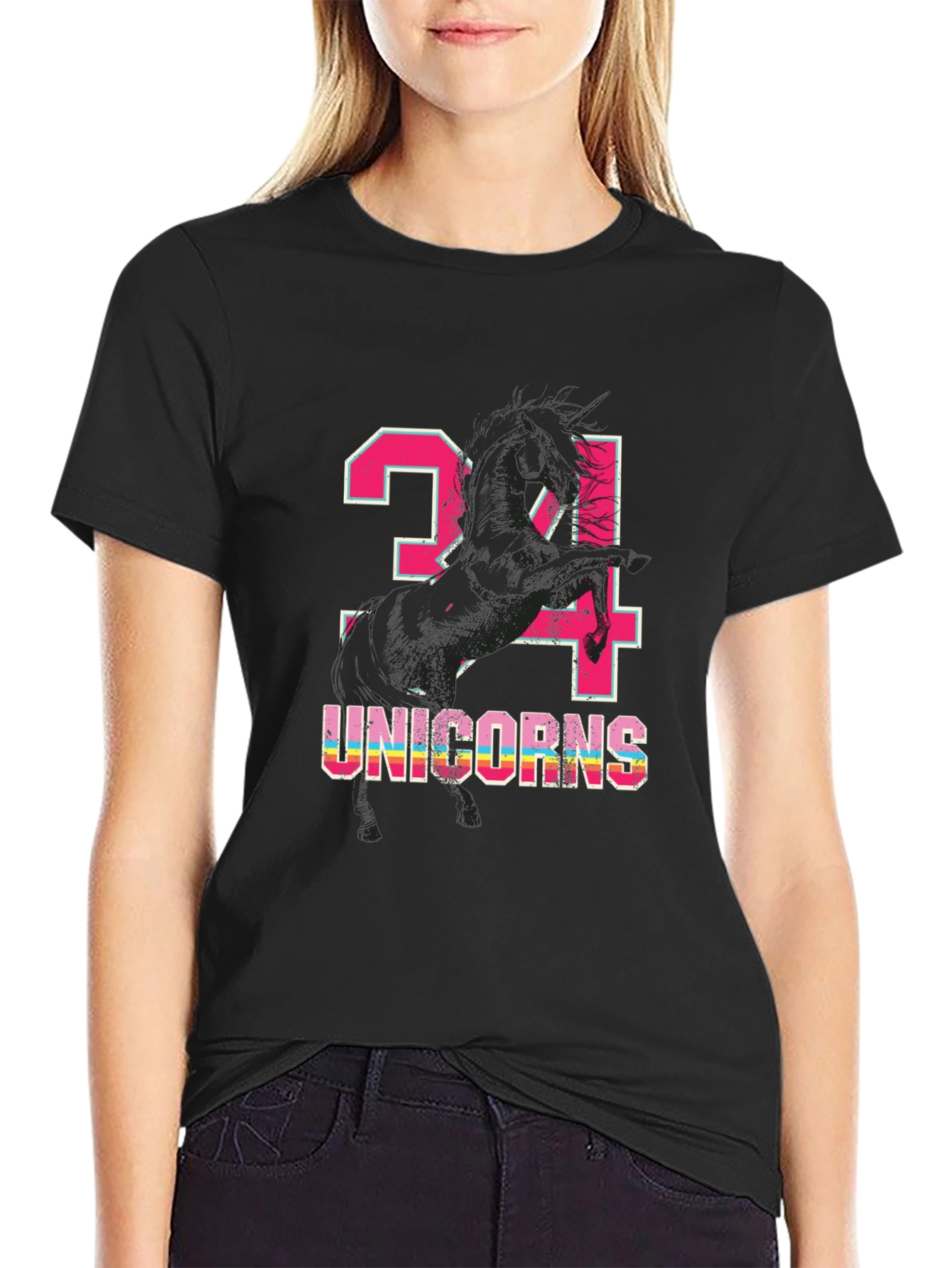 Celebrate a 24th birthday in style with this unique black t-shirt featuring a bold "24 UNICORNS" design! The number 24 is outlined in pink and filled with a playful unicorn silhouette. Below the numbers, the word "UNICORNS" is printed in vibrant, multi-colored stripes, adding a fun and festive touch. This casual, short-sleeved tee is perfect for birthday parties, everyday wear, or as a memorable gift for the unicorn lover turning 24. Show off your playful side with this eye-catching statement piece!