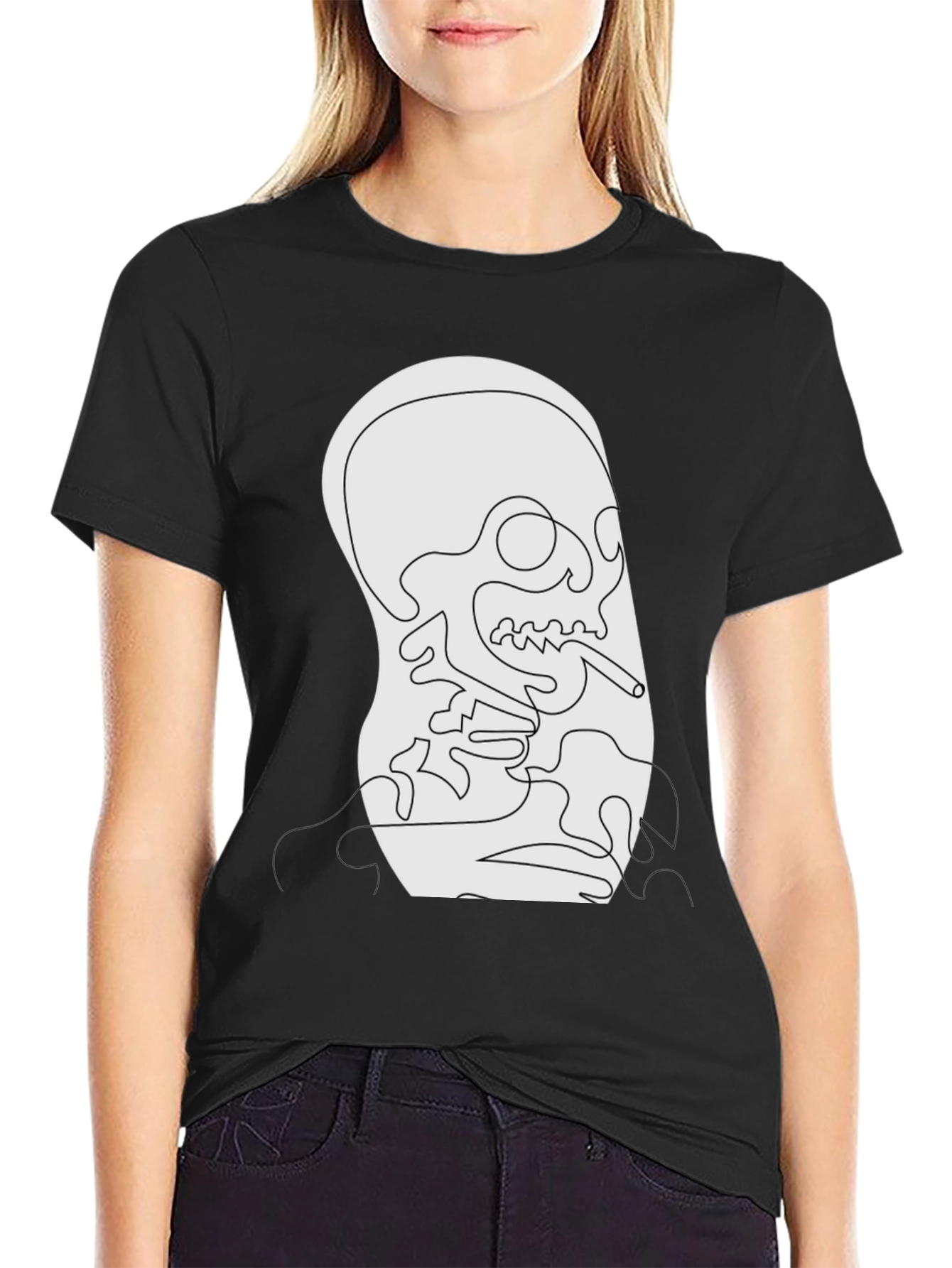 Show off your edgy style with this unique black t-shirt. The shirt features a minimalist, one-line style drawing of a skull, giving it a modern and artistic look. Made from a comfortable-looking material, this tee is perfect for casual wear. The simple yet striking design makes it a great conversation starter and a bold addition to any wardrobe. Wear it out with friends, to a concert, or just relaxing at home. This unique t-shirt will surely turn heads. Get yours now and show off your cool side!