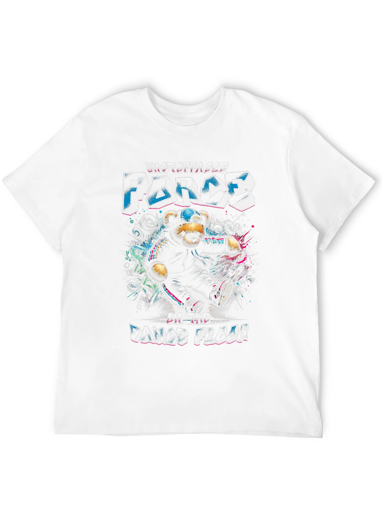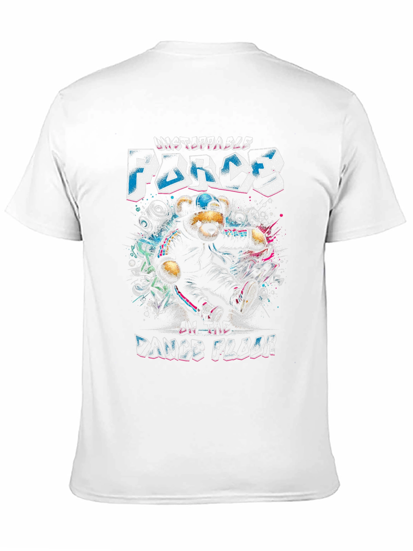 Show off your moves with this eye-catching black t-shirt! The vibrant design features an animated teddy bear in a cap and jacket, tearing up the dance floor amidst a backdrop of colorful graffiti and music-themed elements. Boldly emblazoned with the phrase "Unstoppable Force on the Dance Floor," this tee is perfect for anyone who loves to dance, enjoys unique streetwear, or wants to make a statement. Made from comfortable material, this shirt is ideal for casual outings, dance parties, or everyday wear. Get yours and bring the beat wherever you go!