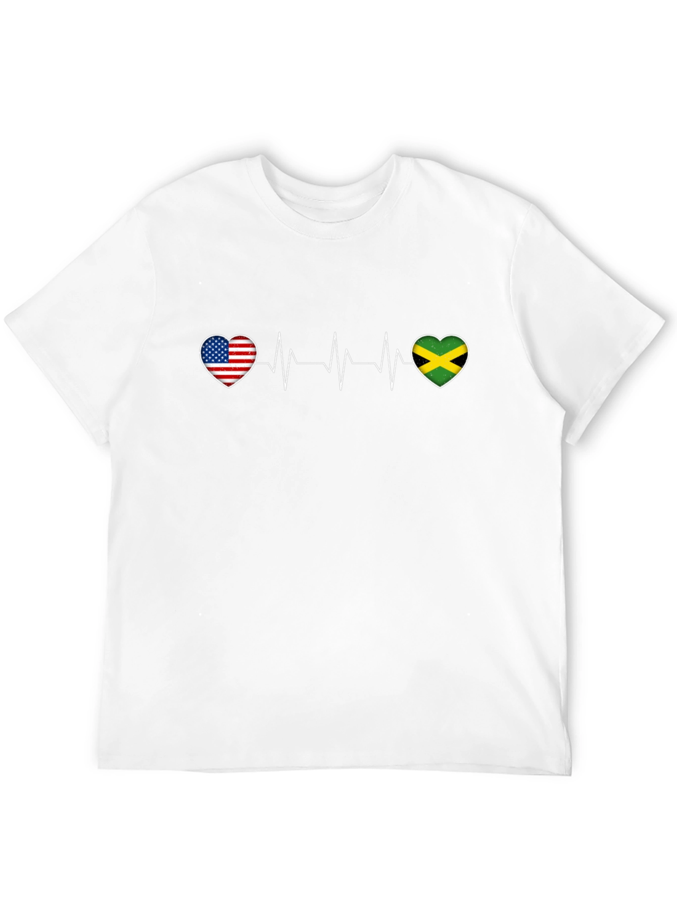Show off your love for the USA and Jamaica with this eye-catching graphic t-shirt! Featuring a heartbeat line connecting a heart with the American flag to a heart with the Jamaican flag, this shirt is perfect for anyone with a connection to both countries. The design is printed on a classic black t-shirt, offering a versatile style that's easy to pair with jeans, shorts, or your favorite casual wear. Made from comfortable, breathable fabric, this shirt is ideal for everyday wear, sporting events, or celebrating cultural heritage. Grab yours now and make a statement!
