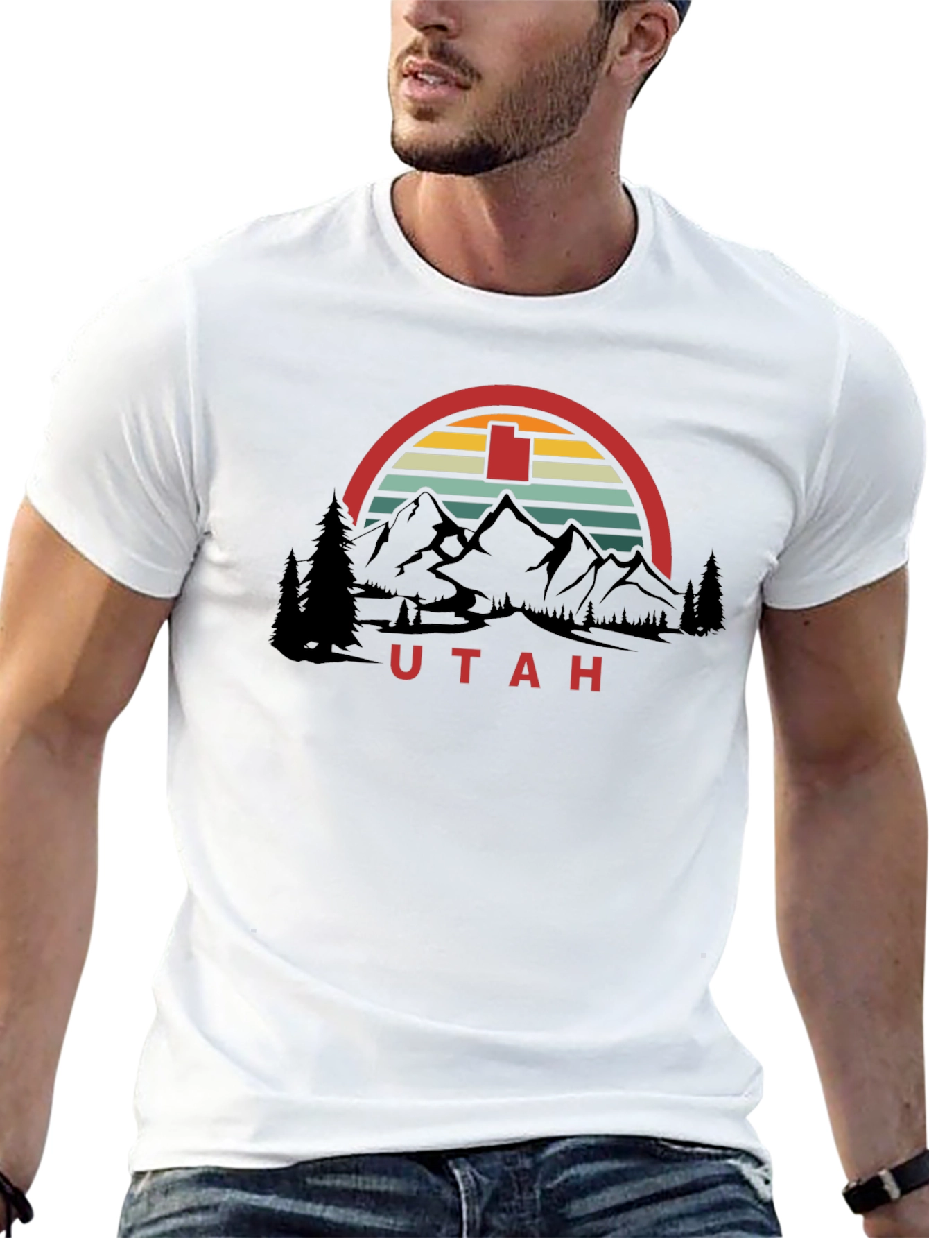 Show your love for Utah with this stylish, black graphic t-shirt. Featuring a retro-inspired design, the shirt showcases the outline of the state set against a backdrop of majestic mountains, evergreen trees and vibrant colored stripes within a semi-circle. The word "UTAH" is printed in bold lettering below the design. This comfortable tee is perfect for casual wear, outdoor adventures, or as a souvenir to remember your trip to Utah. Wear your state pride with this unique and eye-catching t-shirt!