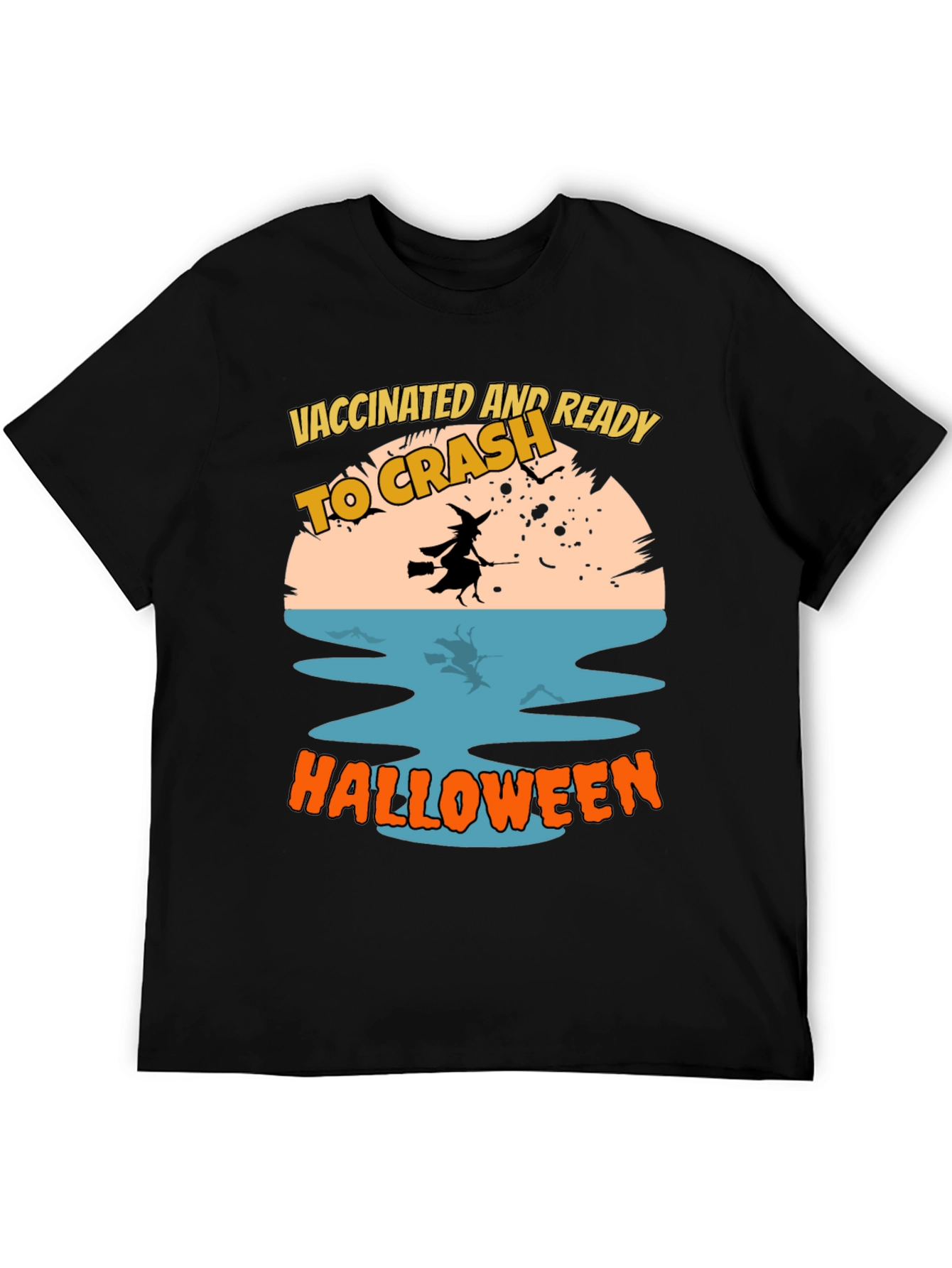 Get ready to celebrate Halloween with this fun and festive t-shirt. The shirt features a witch flying on a broom over water, with the text "Vaccinated and Ready to Crash Halloween." The design incorporates a vintage Halloween vibe with its color palette. This black tee is ideal for Halloween parties, trick-or-treating, or simply showing off your spooky spirit. Made from soft and comfortable fabric, this t-shirt is perfect for all-day wear during the Halloween season.