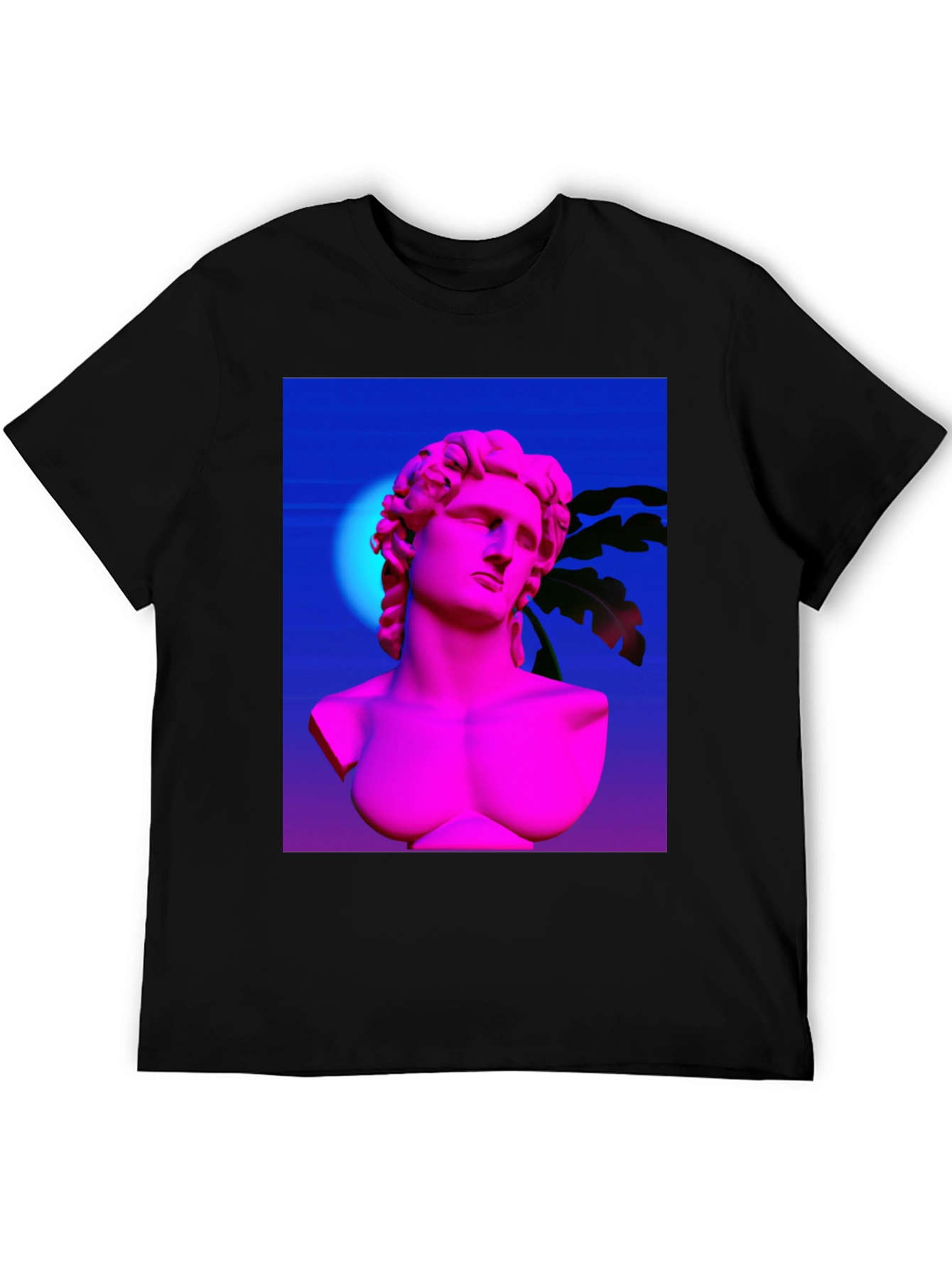 Elevate your style with this eye-catching black t-shirt featuring a vibrant, vaporwave-inspired design. The shirt showcases a neon pink classical statue bust set against a dreamy blue and purple gradient background, complete with palm tree silhouettes. This tee is perfect for adding a pop of color and retro-futuristic flair to any outfit. Made from a comfortable, breathable fabric, it's ideal for everyday wear. Stand out from the crowd and express your unique sense of style with this artistic and trendy graphic tee. Pair it with jeans, shorts, or a skirt for a cool, casual look.