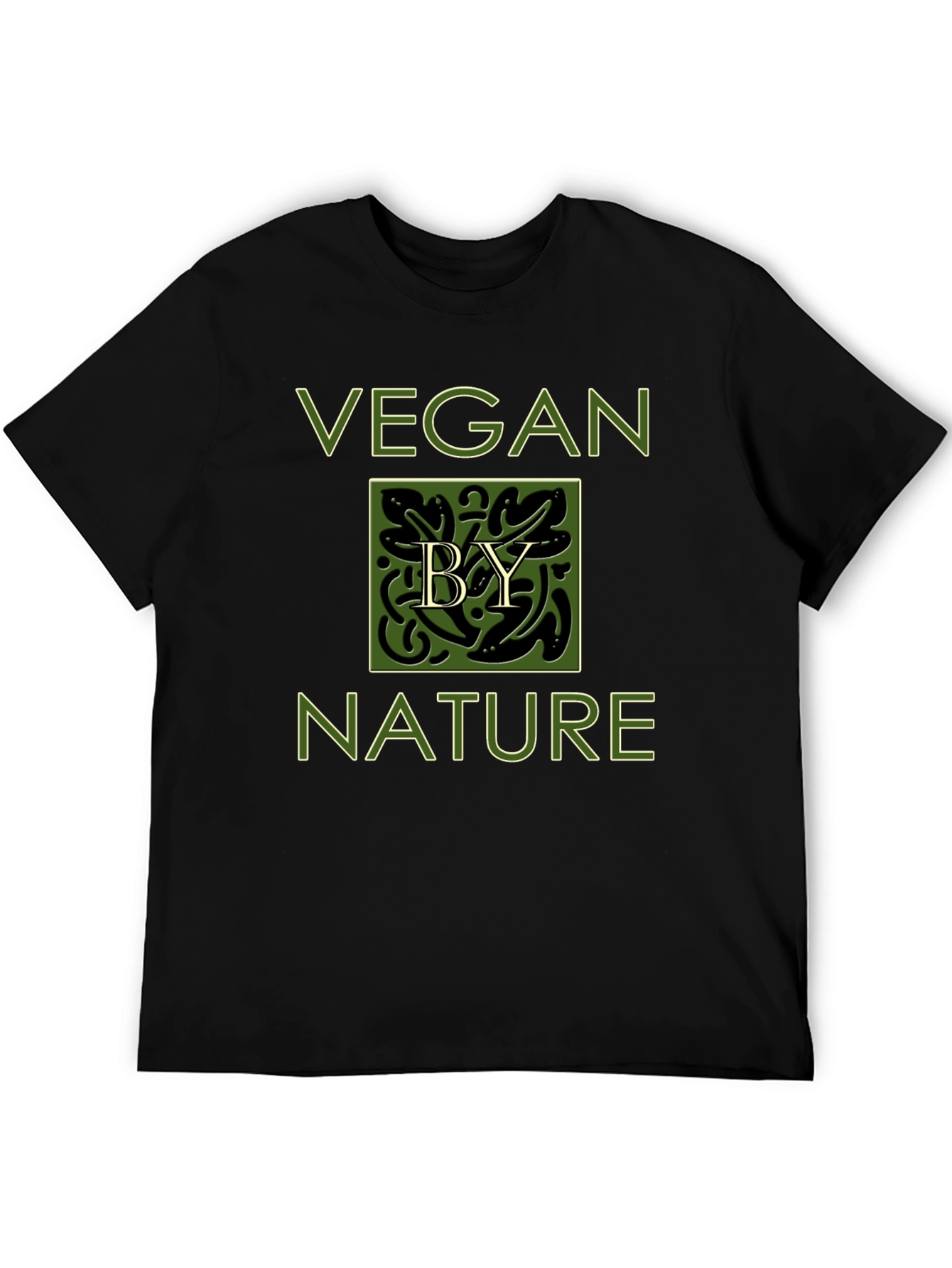 Show your love for a plant-based lifestyle with this stylish black t-shirt. Featuring a bold "Vegan By Nature" graphic in green, this tee makes a statement. The graphic includes a nature-inspired square design. Made from what appears to be comfortable material, this shirt is perfect for everyday wear, casual outings, or to spread awareness about veganism. A great conversation starter and a wardrobe staple for any vegan advocate. Get yours today and wear your values!