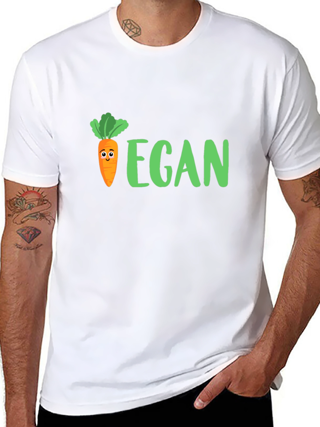 Show off your love for veganism with this adorable carrot-themed t-shirt! This black tee features a charming carrot graphic with cute eyes, playfully replacing the 'V' in 'Vegan'. The word 'EGAN' is printed in bright green. Made from a soft, comfortable fabric, this shirt is perfect for everyday wear and makes a statement about your lifestyle. Ideal for casual outings, vegan festivals, or simply relaxing at home. Express your passion for plant-based living with this fun and stylish t-shirt!