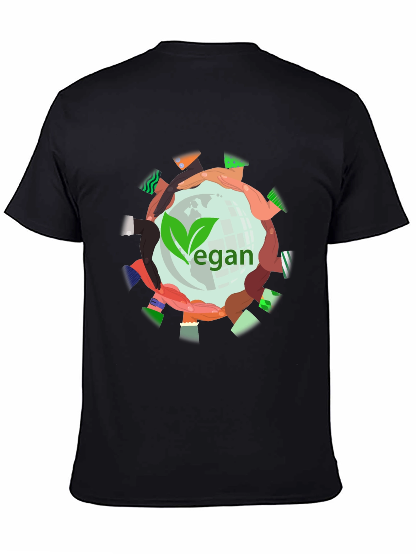 Show your love for a vegan lifestyle with this stylish black T-shirt. Featuring a unique graphic design with a world globe surrounded by hands of different colors, representing global unity. The word "Vegan" is incorporated within the image, accompanied by green leaves, symbolizing nature and eco-consciousness. Made from comfortable materials, this tee is perfect for everyday wear. Ideal for casual outings, vegan festivals, or simply expressing your values. Stand out and spread a positive message with this eye-catching vegan T-shirt. Perfect for any environmentally conscious individual.