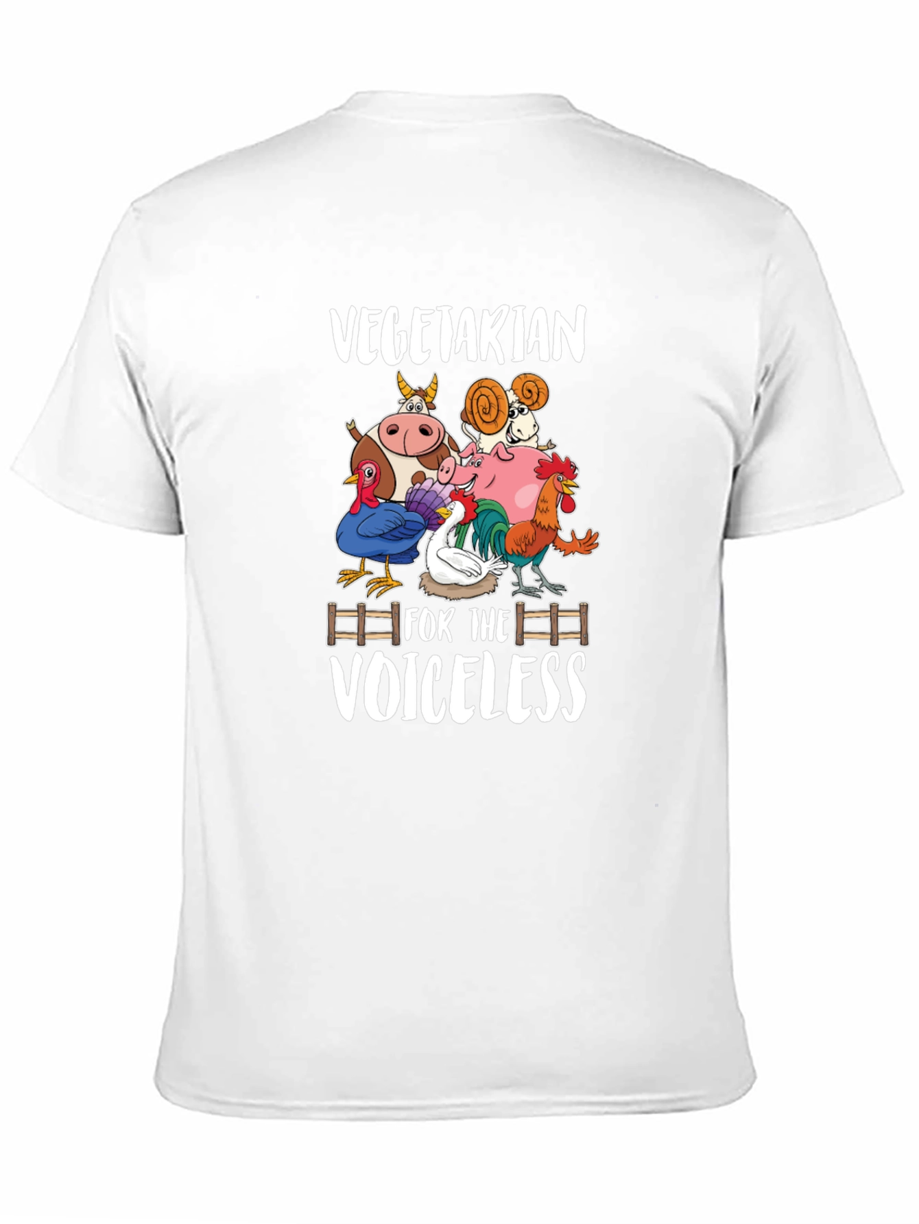 Advocate for animal rights with this eye-catching black t-shirt! The tee features a colorful cartoon graphic showcasing farm animals—a cow, pig, chicken, and rooster—behind a wooden fence. Above, the bold white text proclaims "VEGETARIAN FOR THE VOICELESS". Made from a soft, comfortable fabric, this shirt is perfect for everyday wear, protests, or casual outings. Let your values shine and start conversations with this unique and meaningful design. Show your support for the voiceless while staying stylish and comfortable!