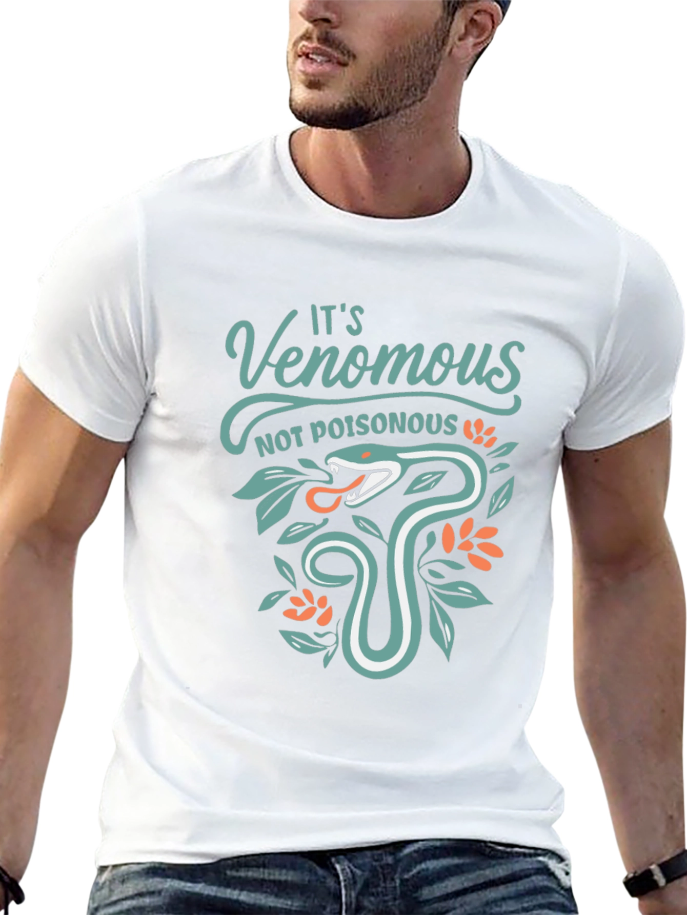 Show your love for reptiles with this unique graphic tee. This black t-shirt features a bold design of a venomous snake intertwined with leaves and flowers, accompanied by the text "It's Venomous NOT Poisonous". Made from a soft, comfortable fabric, it's perfect for everyday wear. Whether you're a reptile enthusiast or just appreciate eye-catching designs, this tee is sure to spark conversation. Pair it with jeans or shorts for a casual, cool look. Add a touch of edgy style to your wardrobe with this snake graphic tee!