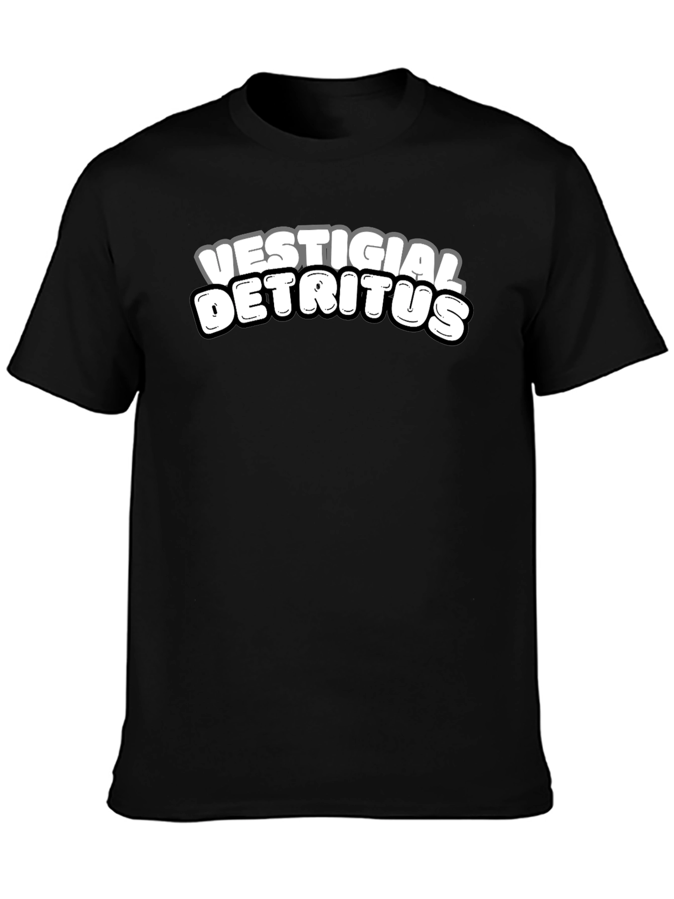 This classic black tee features a bold graphic print of the words 'Vestigial Detritus' in a stylized, cartoon-like font with a distinct white outline and a grey shadow effect. The shirt appears to be made of a comfortable cotton blend. The design is simple yet eye-catching, making it a fun conversation starter. Perfect for casual wear, it's a great way to express your unique sense of humor and style. Whether you're heading to a casual gathering, a day out with friends, or simply relaxing at home, this tee is sure to make a statement. Grab yours today and let your inner nerd shine!
