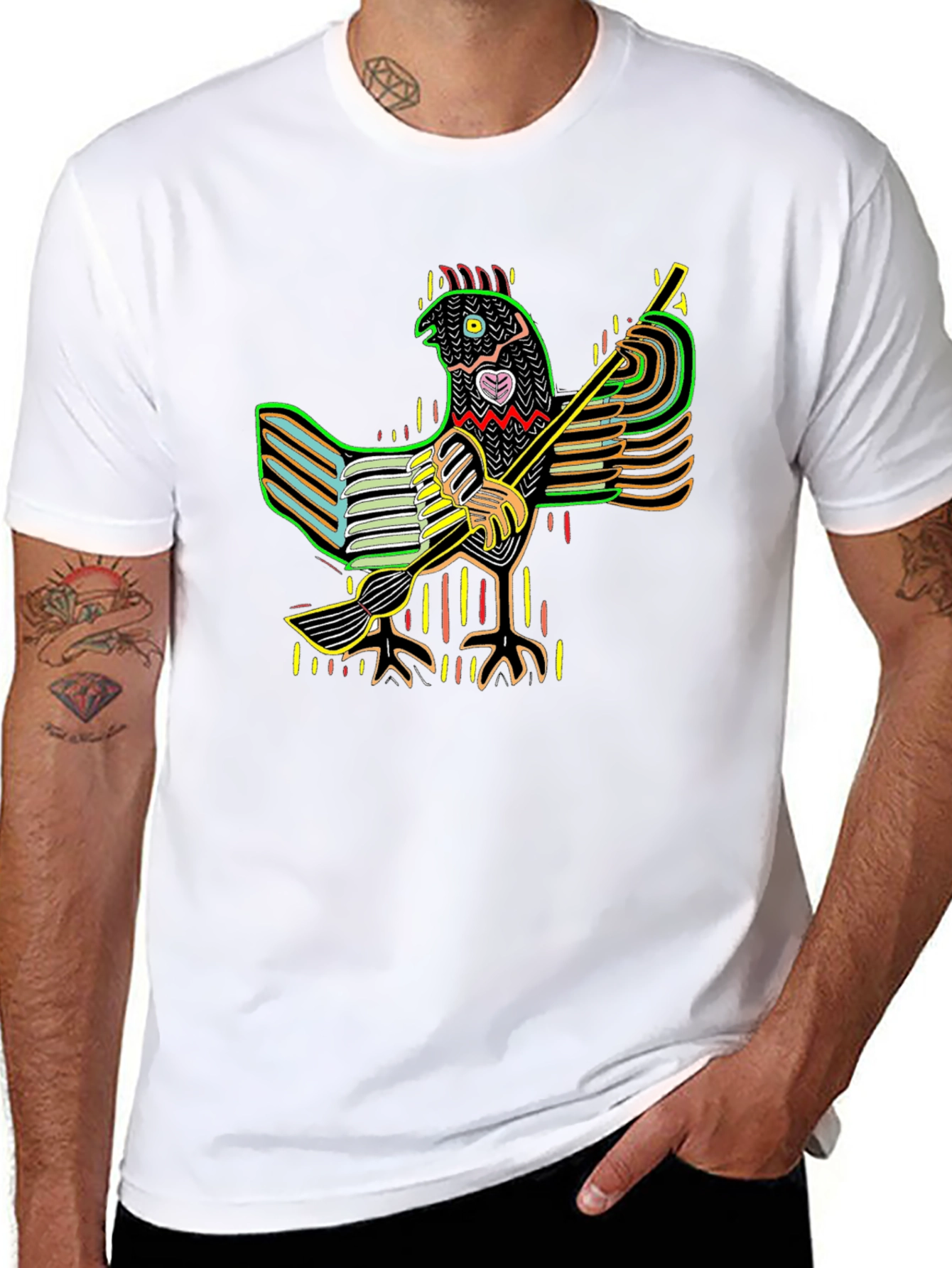 Show off your unique style with this eye-catching black t-shirt! Featuring a brightly colored, folk-art inspired graphic of a rooster, this tee is sure to turn heads. The design boasts intricate line work in various hues, creating a bold and playful aesthetic. Crafted from comfortable-looking cotton, this shirt offers both style and ease. Perfect for casual outings, concerts, or simply expressing your artistic side. Stand out from the crowd with this statement piece that adds a pop of color and personality to any outfit.