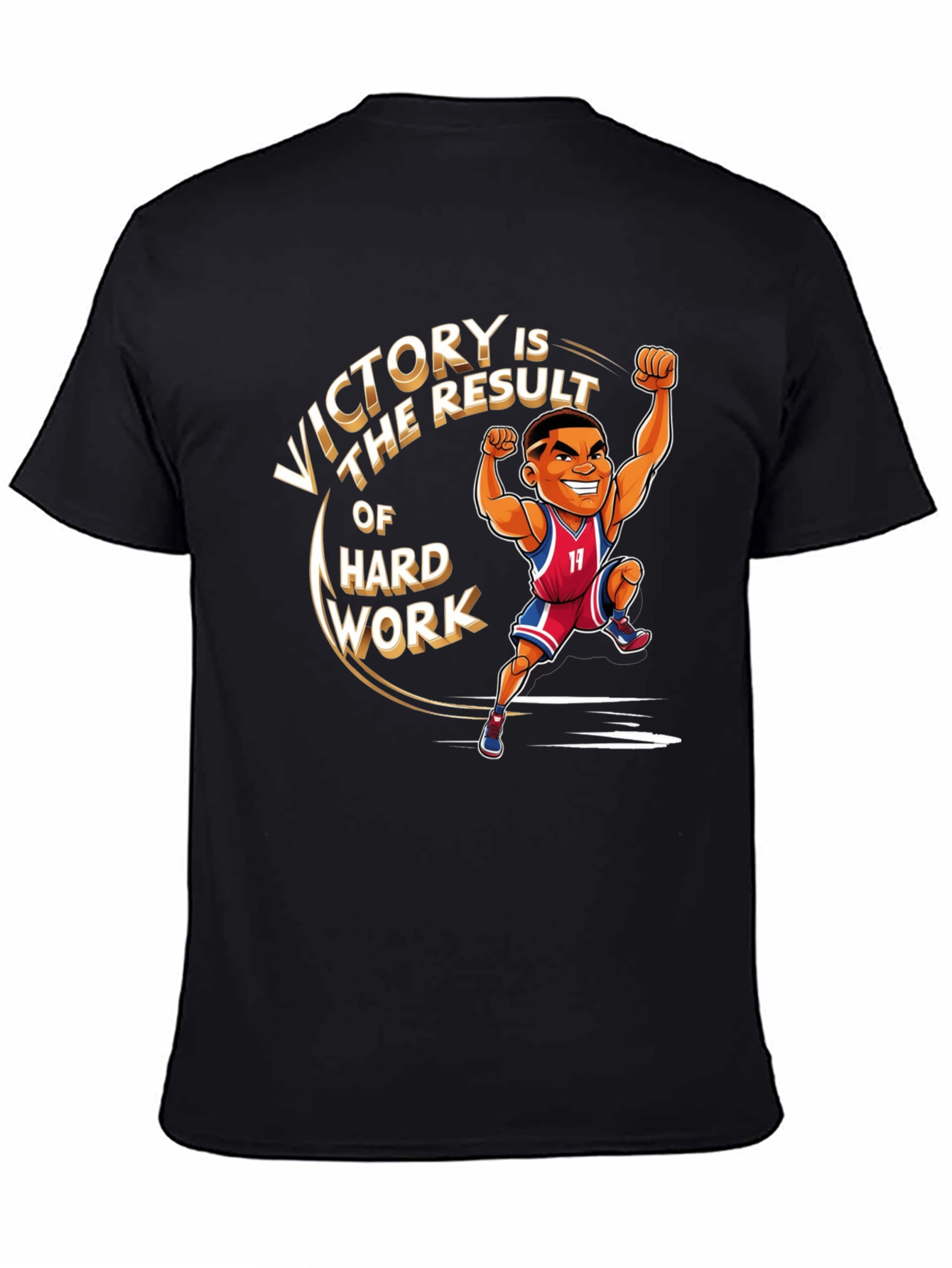 Show your dedication to success with this motivational black t-shirt! Featuring a vibrant graphic of a basketball player celebrating, alongside the empowering message "Victory is the Result of Hard Work", this tee is perfect for athletes, students, and anyone pursuing their dreams. The design incorporates sporty elements and bold text, making it a standout piece. Made from comfortable, breathable fabric, it's ideal for casual wear, workouts, or as a daily reminder to stay focused on your goals. Wear your motivation proudly and inspire those around you!