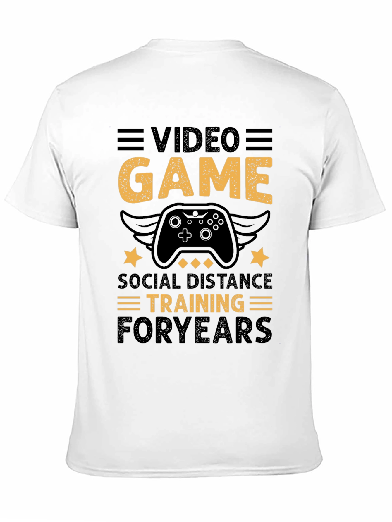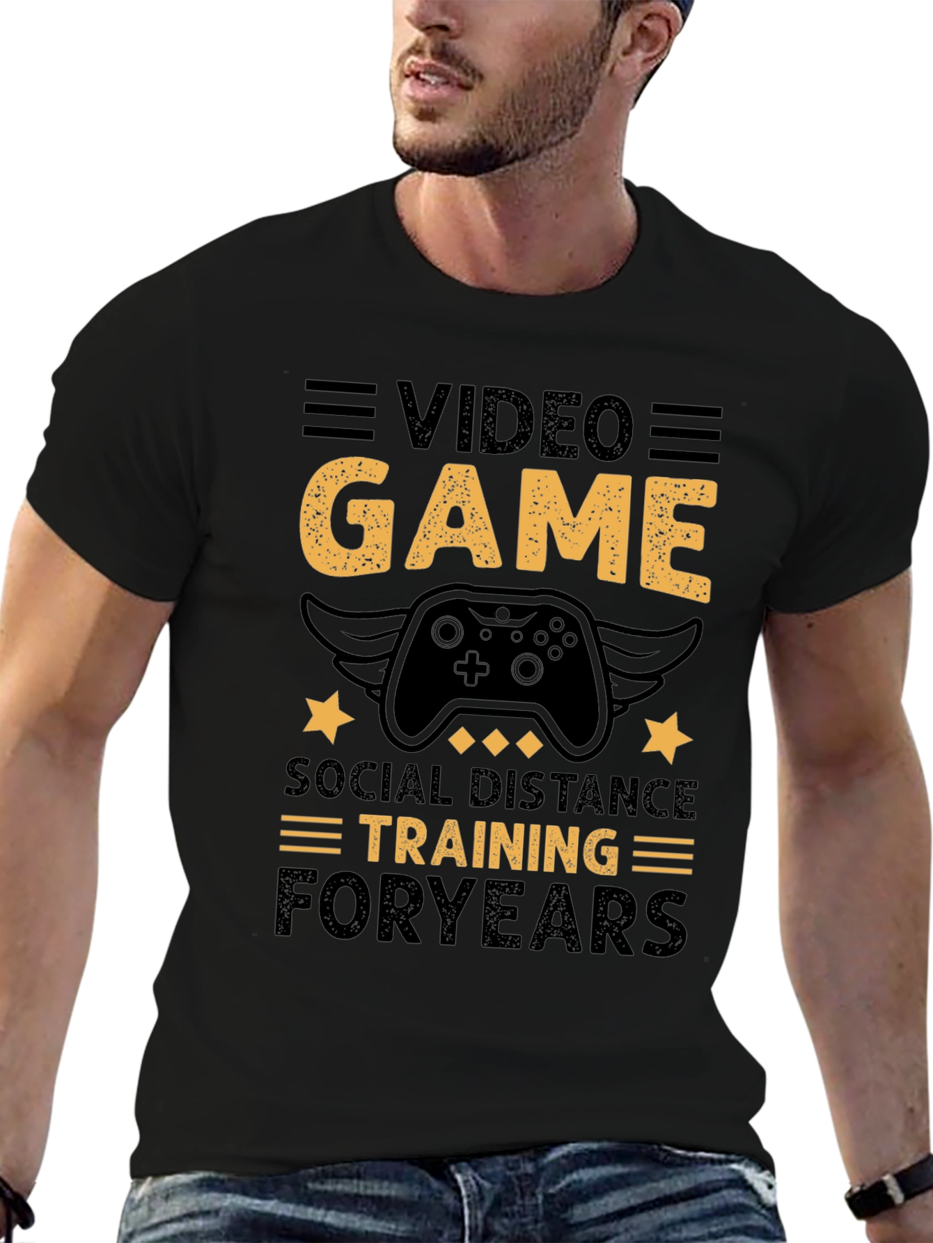 This black t-shirt features a humorous design for video game enthusiasts. The print includes the phrase "VIDEO GAME SOCIAL DISTANCE TRAINING FOR YEARS," surrounding a controller graphic with wings and stars. The distressed gold font gives it a vintage feel. Made from what appears to be a soft, breathable cotton blend, it's perfect for casual wear, gaming sessions, or hanging out with friends. This funny tee is a great conversation starter and an ideal gift for gamers who appreciate a good joke and social distancing!
