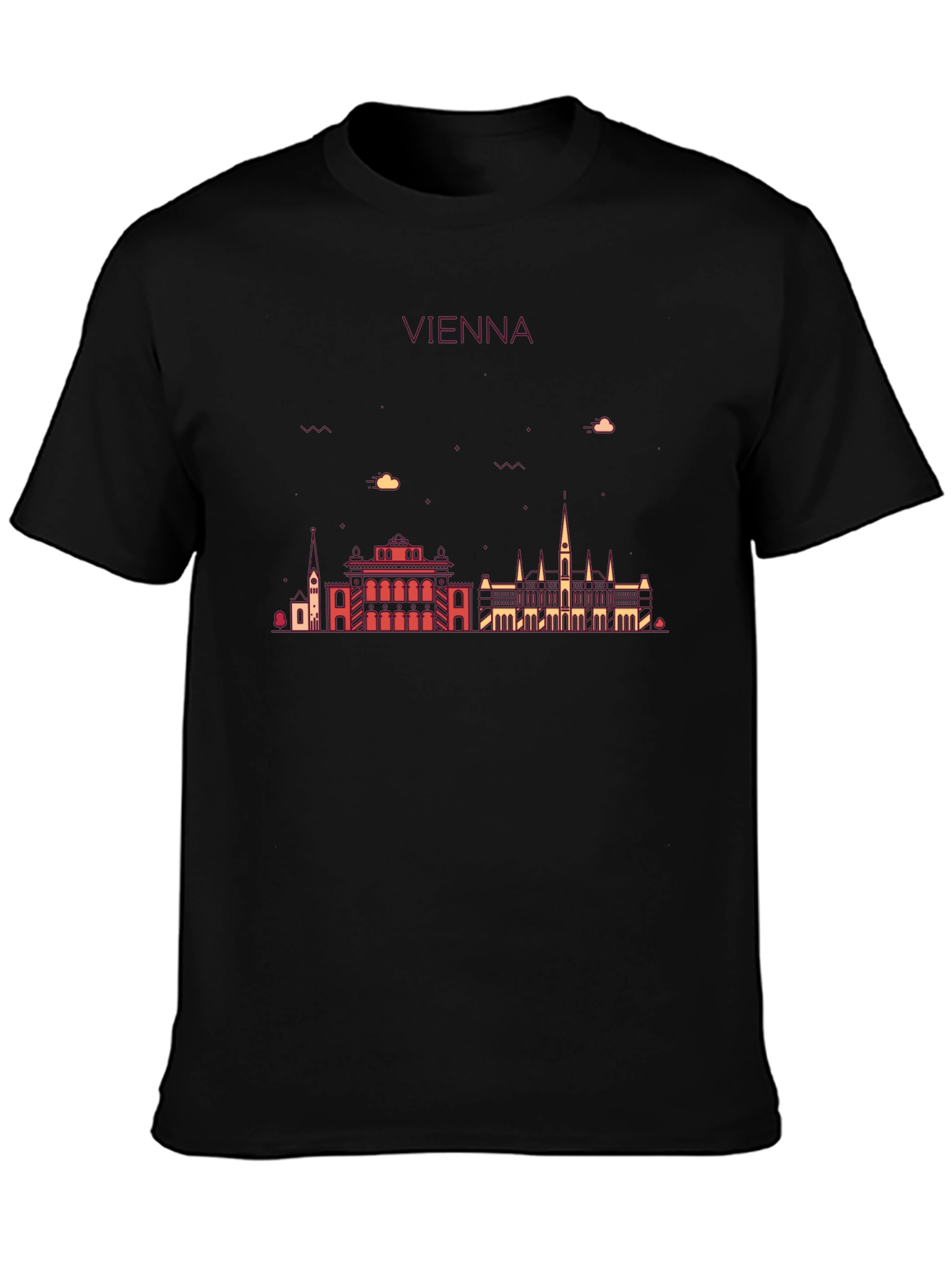 Show off your love for Vienna with this stylish black graphic tee. The shirt features a minimalist skyline design in contrasting colors, depicting iconic Vienna landmarks. Made from comfortable, breathable fabric, this tee is perfect for everyday wear. Its versatile design makes it easy to pair with jeans, shorts, or even a casual blazer. Whether you're a Vienna native, a frequent visitor, or simply appreciate architectural beauty, this shirt is a great way to express your passion. A must-have addition to any casual wardrobe.