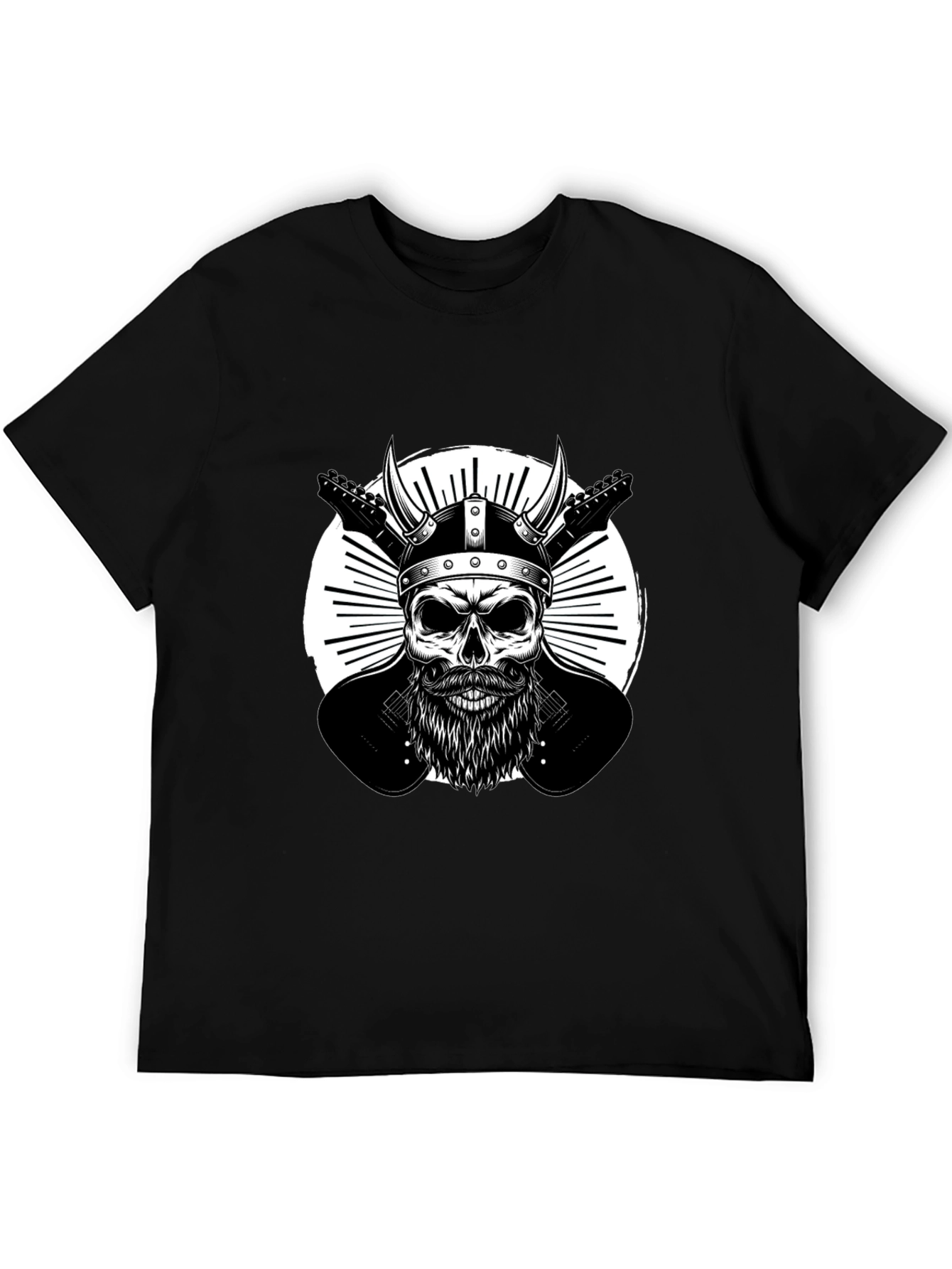 Rock a fierce look with this black graphic tee! It features a striking design of a skull wearing a Viking helmet, complete with horns. In the background, two guitars are crossed, adding a rock-and-roll edge to the Viking theme. Perfect for casual wear, concerts, or expressing your unique style, this t-shirt is sure to turn heads. The bold graphic is printed on a soft fabric for comfortable all-day wear. Show off your edgy side and make a statement with this killer Viking skull t-shirt!