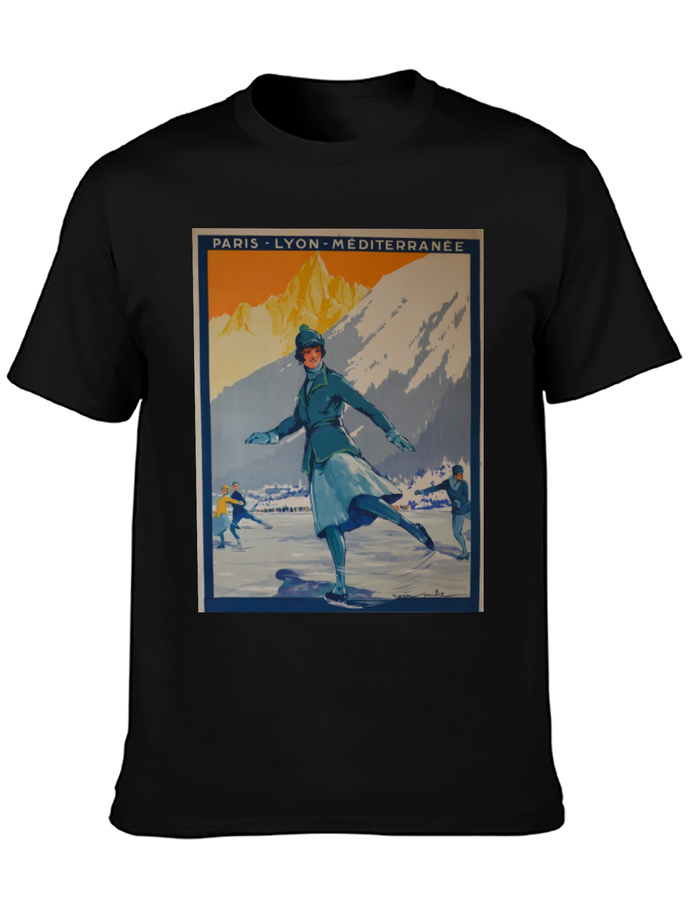 Embrace vintage charm with this unique black t-shirt, featuring a classic Paris-Lyon-Méditerranée travel poster design. The shirt showcases a woman ice skating on a snowy landscape. The print includes other skaters, snow capped mountains, and orange and blue skies. This eye-catching design adds a touch of retro elegance to your wardrobe, making it a perfect conversation starter and a standout piece for casual outings. The comfortable fabric ensures a great fit and feel, while the vibrant print stays bold wash after wash. Wear your love for vintage travel and iconic design with this must-have t-shirt.