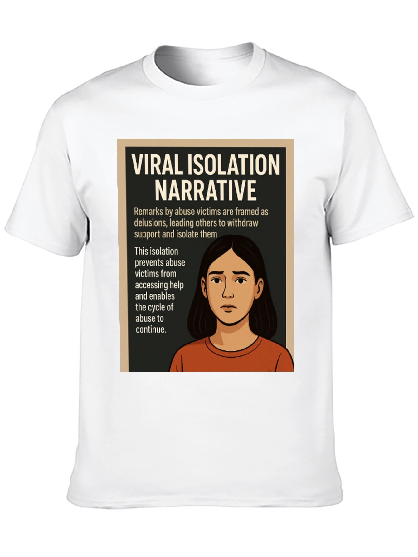 This black t-shirt features a bold graphic print addressing the issue of viral isolation and its impact on abuse victims. The design presents the message "Viral Isolation Narrative" alongside text highlighting how remarks by abuse victims are often framed as delusions, leading to withdrawal of support and further isolation. The graphic also includes an illustration of a concerned-looking woman. The t-shirt appears to be made of a comfortable, breathable fabric. This shirt can make a statement and raise awareness.