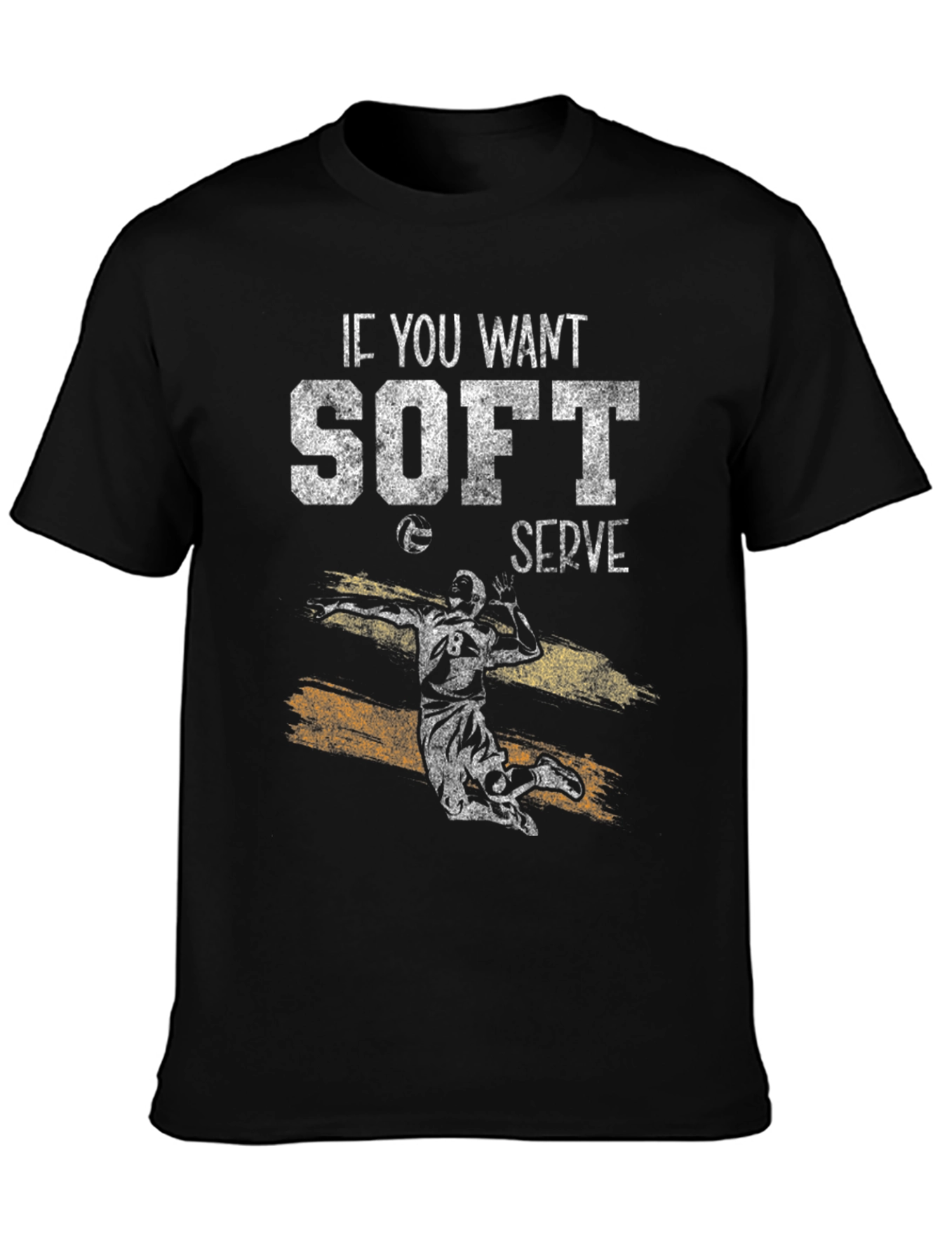 Show your love for volleyball with this cool graphic tee. The shirt features a vintage-style design of a volleyball player in action, ready to serve. "IF YOU WANT SOFT SERVE" is printed in a distressed font above the graphic, adding a touch of humor and attitude. Made from comfortable, breathable fabric, this tee is perfect for athletes and fans alike. Wear it to your next game, practice, or casual outing to make a statement. Great for gifting to the volleyball player in your life.