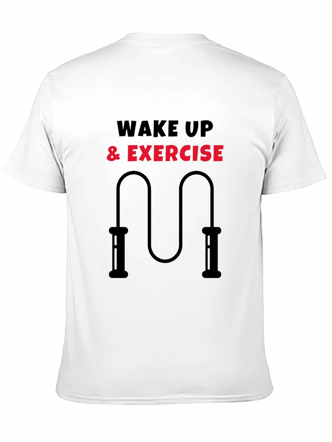 Get motivated with this stylish black t-shirt. Featuring the inspiring message "Wake Up & Exercise" in a striking red font, complemented by a jump rope graphic, this shirt is perfect for fitness enthusiasts. Made from comfortable fabric, it's ideal for workouts, casual outings, or simply lounging around. Show off your dedication to health and fitness with this eye-catching and comfortable tee. Available in various sizes.