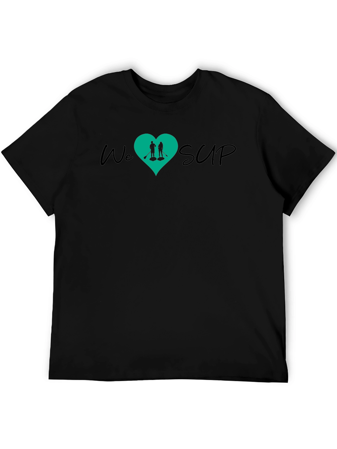Show your love for stand-up paddleboarding with this stylish black t-shirt. Featuring a unique graphic of "We <3 SUP," the design incorporates a vibrant heart with silhouettes of two paddleboarders. Made from a comfortable-looking fabric, this tee is perfect for casual wear, beach outings, or showing off your passion for water sports. This eye-catching design will make you stand out and spark conversations with fellow SUP enthusiasts. Grab yours today and wear your love for paddleboarding!