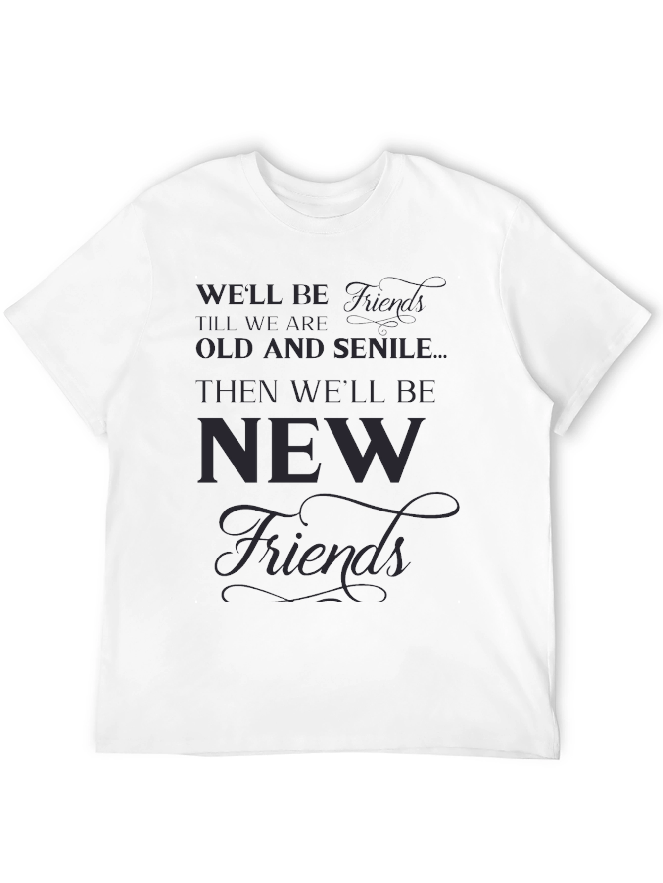 This classic black t-shirt features a humorous saying: "We'll Be Friends till we are old and senile... then we'll be new friends". The saying is printed in a muted gray-toned font, giving it a stylish, understated look. The shirt appears to be made from a soft and comfortable material, perfect for casual wear. This tee is a fun conversation starter, ideal for hanging out with friends, family gatherings, or everyday wear. It makes a great gift for the friend who loves witty sayings and appreciates comfortable style. This t-shirt seamlessly combines comfort and humor, making it a must-have for those who value a relaxed yet unique sense of fashion.